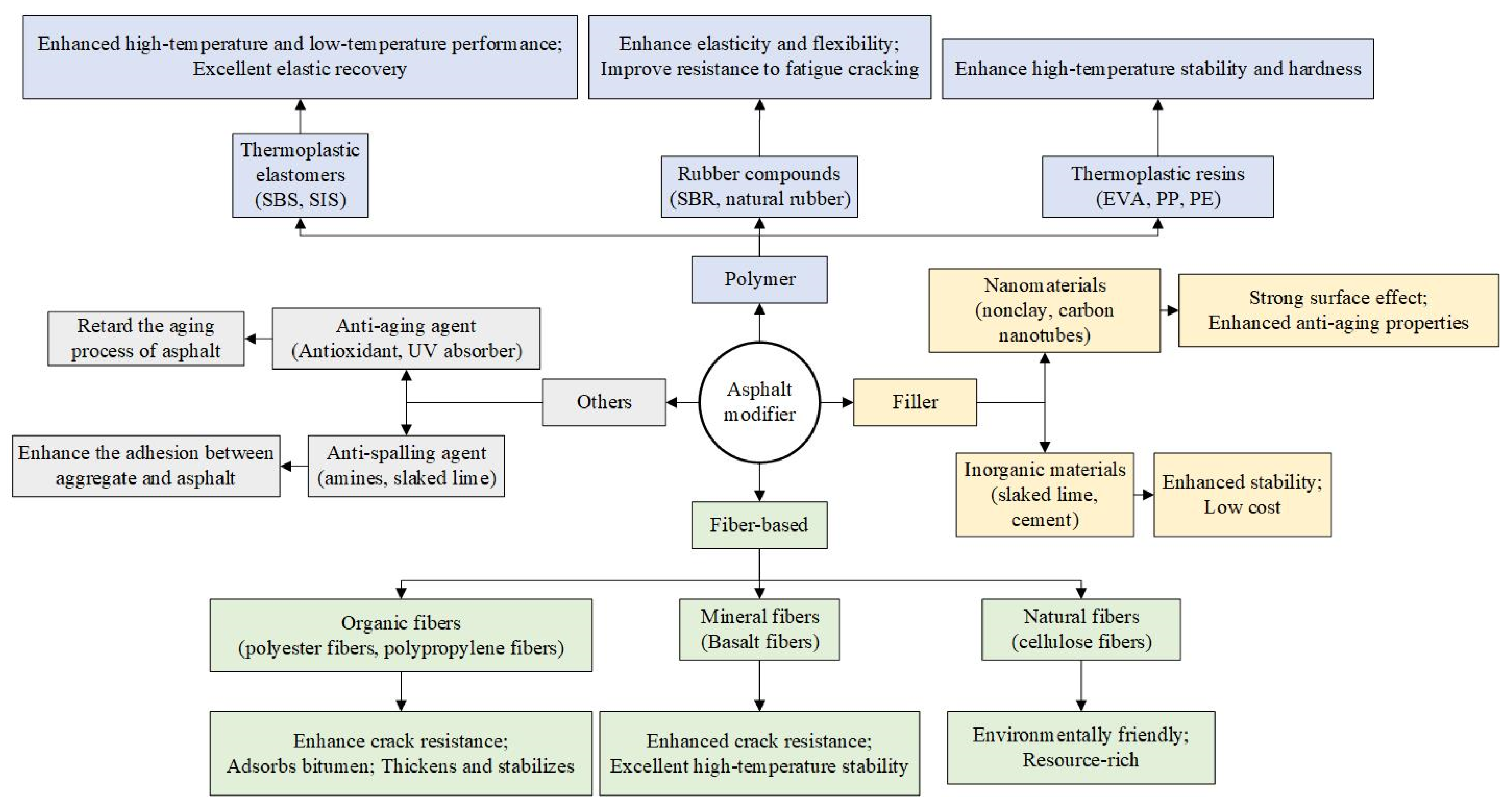 | Matrix asphalt | SiO2, CaCO3 | COMPASSII | Adhesion energy; debonding energy; degradation ratio (RAD); energy ratio (ER) | The adhesion between asphalt and aggregates diminishes with increasing chloride salt concentration, as chloride solutions spontaneously separate asphalt from aggregates. SiO2 exhibits superior adhesion to asphalt, thereby offering enhanced resistance to chloride salt erosion [85]. |