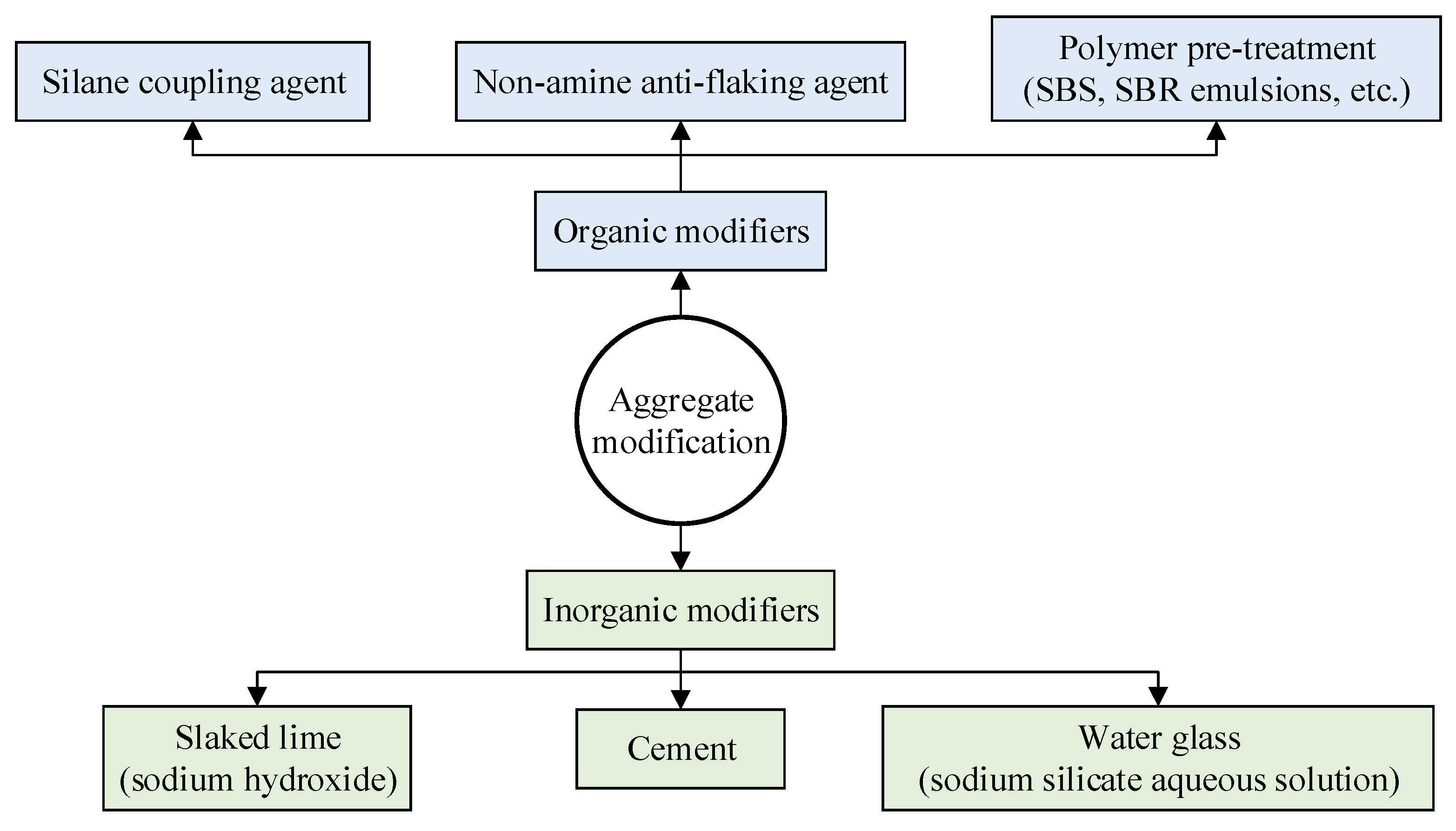 - Yang, M.; Huang, T.; Lv, S.; Zheng, J. Effect and mechanism of acidic aggregate surface silane modification on water stability of asphalt mixture. Road Mater. Pavement Des. 2021, 22, 1654–1666. [Google Scholar] [CrossRef]
