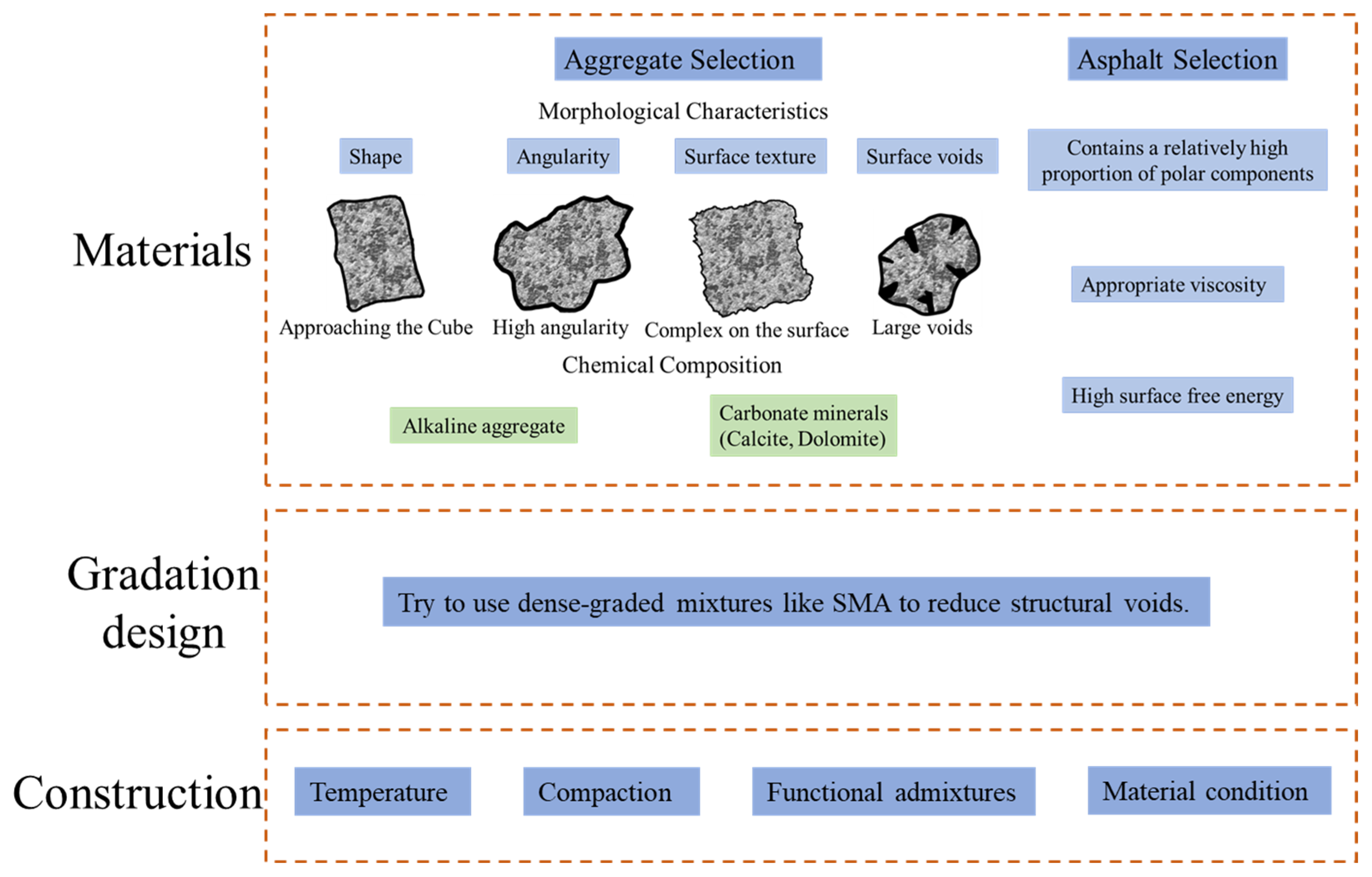 | SBS-modified asphalt; basalt; limestone | Slow-release anti-icing agent (primarily composed of NaCl) | Dynamic shear rheometric; low-temperature flexural rheology; contact angle measurement | Slow-release anti-icing agents enhance the hydrophobicity of asphalt, leading to a reduction in the adhesive work between asphalt and aggregates. Concurrently, the cohesive strength within the asphalt also diminishes to some extent. Ultimately, this results in the failure of the asphalt–aggregate bond, causing aggregate loss [26]. |
