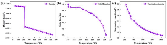 Temperature-dependent curves of thermophysical data of SAC0307 alloy: (a) Density; (b) Solid fraction; (c) Newtonian viscosity.