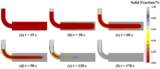 Simulation results of solid fraction evolution during the solidification process, (a) 15 s, (b) 30s, (c) 60 s, (d) 90 s, (e) 120 s, (f) 170 s.