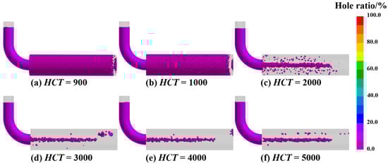 The simulated distribution of porosity defects is displayed in Figure 5. As shown, the defects are predominantly concentrated along the central axis of the ingot, manifesting as a large, continuous band of macro-shrinkage, while peripheral regions remain relatively sound with only minor, dispersed microporosity observed at the far right end. This distinct distribution pattern is intrinsically linked to the solidification dynamics governed by the water-cooling boundary condition, where the directional solidification front progresses from the outer surface toward the thermal center. Consistent with the mushy zone evolution described in previous studies [27], the simulation captures the formation of a deep, narrow U-shaped mushy zone along the central axis during the final solidification stage. Within this constricted region, the flow of residual liquid metal required to feed solidification shrinkage is severely impeded. As explained by the momentum transport theory for interdendritic flow [28], the hydraulic resistance in such a dense dendritic network is dominated by the Darcy term, leading to a substantial pressure drop. When the local pressure falls below the cavitation threshold or when the feeding path is completely cut off by solid bridging, the volume deficit created by the thermal contraction of the metal cannot be compensated, resulting in the observed centerline porosity. The agreement between this theoretical mechanism and the simulated defect morphology confirms that the model parameters adequately represent the physical solidification conditions. These findings highlight that the inherent solidification path under initial conditions is insufficient to ensure internal soundness. Therefore, to eliminate these porosity defects, it is necessary to optimize the process parameters, specifically the PCT and the HTC. By adjusting the solidification mode, the occurrence of defects can be prevented.