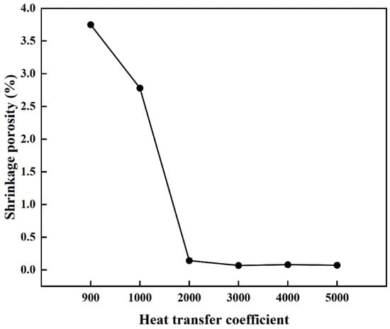 This study employed numerical simulation to systematically investigate the influence of varying Interfacial HTC on porosity formation during mold filling and solidification. As illustrated in Figure 8 and quantified in Figure 9, the HTC exerts a significant impact on both the morphology and total fraction of porosity under the conditions of a 330 °C PCT and a 15 s pouring time. When the HTC was below 2000 W/(m2·K), porosity was observed to be distributed throughout the entire ingot, which is primarily attributed to the reduced solidification rate and diminished temperature gradient that promote a broad mushy zone and obstruct interdendritic feeding paths. This behavior aligns with general findings in gravity casting, where insufficient or non-uniform cooling is known to result in molding defects due to prolonged solidification times. Conversely, when the HTC exceeded 2000 W/(m2·K), porosity became significantly reduced and concentrated along the central axis. This transition indicates that a higher heat transfer rate accelerates the solidification of the casting periphery and establishes a steep temperature gradient that optimizes the solidification mode to maintain unobstructed feeding channels. This mechanism is consistent with recent experimental investigations [31], which demonstrated that enhancing mold cooling efficiency (e.g., via conformal channels) significantly refines the average grain size. Such microstructural refinement, driven by rapid heat extraction, is known to improve the mechanical integrity of the casting. Furthermore, related research has highlighted that optimizing thermal conditions to control the solidification process is critical for minimizing defect susceptibility in complex alloys. Collectively, these studies support our observation that a higher HTC promotes a finer, more homogeneous structure that facilitates better feeding [32]. Statistical analysis confirms that the porosity fraction reaches a minimum at 3000 W/(m2·K) and subsequently plateaus, suggesting that while enhancing heat transfer effectively improves casting quality by mitigating defects associated with slow cooling, there exists a threshold beyond which further increases in HTC yield negligible benefits due to inherent thermal conductivity limitations. Therefore, 3000 W/(m2·K) is identified as the optimal HTC for minimizing porosity in this process.