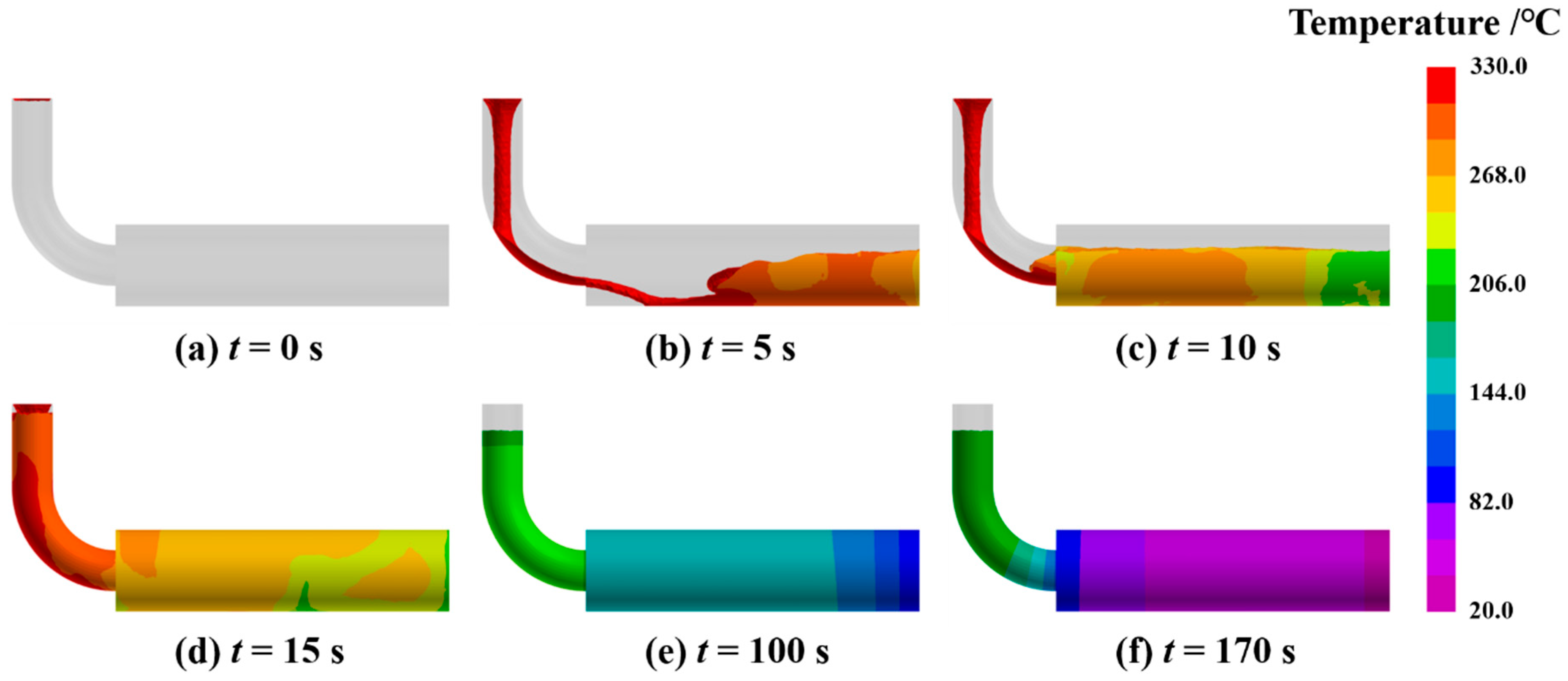 - Zhang, Z.; Pan, Y.; Dong, A.; Chen, Z.; Sui, D. Numerical Simulation-Driven Optimization of the Counter-Gravity Adjusted-Pressure Casting Process for Large Thin-Wall Ni-Based Superalloy Combustion Chamber Casings. J. Mater. Res. Technol. 2025, 37, 1029–1040. [Google Scholar] [CrossRef]