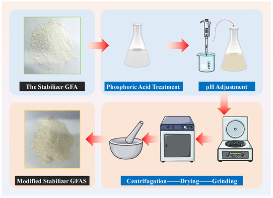 The synthesized stabilizer GFA was immersed in aqueous H3PO4 solutions at varying mass ratios and allowed to stand for 24 h with intermittent stirring. Following this treatment, the solids were recovered and repeatedly washed via centrifugation until the supernatant reached neutral pH. The pH was subsequently adjusted to 10~12 using 1 mol/L NaOH solution. The resulting phosphoric acid-modified granite sawdust-based stabilizer (designated GFAS) was obtained through sequential centrifugation, oven-drying, and pulverization, as schematically illustrated in Figure 3.