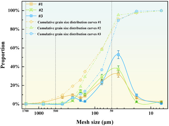 Specifically, a 500 g tailing sample was sequentially passed through a stack of sieves with the following mesh sizes (in ascending order): 2000, 850, 425, 250, 180, 150, 75, 38, 18, and 8 μm. The mass of material retained on each individual sieve was recorded, and the corresponding percentage by mass was calculated [40].