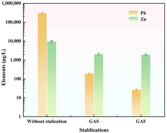 As demonstrated in Figure 8, the stabilizer GAS exhibited significant immobilization of Pb and Zn in tailings waste. In comparison with tailings waste lacking a stabilizer, the incorporation of GAS resulted in a 99.9% reduction in Pb leaching and a 79.1% reduction in Zn leaching, thereby substantiating its efficacy in stabilizing these heavy metals.