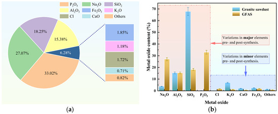 Figure 12a shows the elemental oxide composition of GFAS. The predominant oxides are P2O5 (33.02%), Na2O (27.07%), SiO2 (18.25%), and Al2O3 (15.38%). The elevated P2O5 content primarily originated from the H3PO4 modification treatment, where (PO4)3− anions incorporated into the zeolitic structure and combined with oxygen elements during synthesis. This molecular reorganization resulted in P2O5 detection by XRF, confirming successful structural integration of (PO4)3− groups within the GFAS matrix. Meanwhile, SiO2 and Al2O3 were predominantly derived from the synthesized zeolite (Na6Al6Si10O32). The presence of chloride ions in the synthesized GFAS, as identified in the elemental analysis, is attributed to the acid washing pretreatment stage, where hydrochloric acid (HCl) was employed to activate the raw materials (granite sawdust and fly ash). Although a NaOH solution was subsequently introduced to adjust the pH and provide an alkaline environment for zeolite crystallization, residual chloride species from the initial HCl treatment were partially retained within the silicate framework or on the surface of the particles.