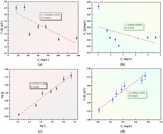 For the adsorption kinetic analysis, the experimental conditions involved adding 0.05 g of GFAS to 100 mg/L solutions of Pb2+ and Zn2+. The samples were subjected to continuous oscillation and aliquots were withdrawn for ICP-OES analysis at specific time intervals: 1, 5, 10, 20, 30, 60, 90, and 240 min. The equilibrium adsorption capacity, denoted as Qe, was calculated based on Equation (2) [44,45]: