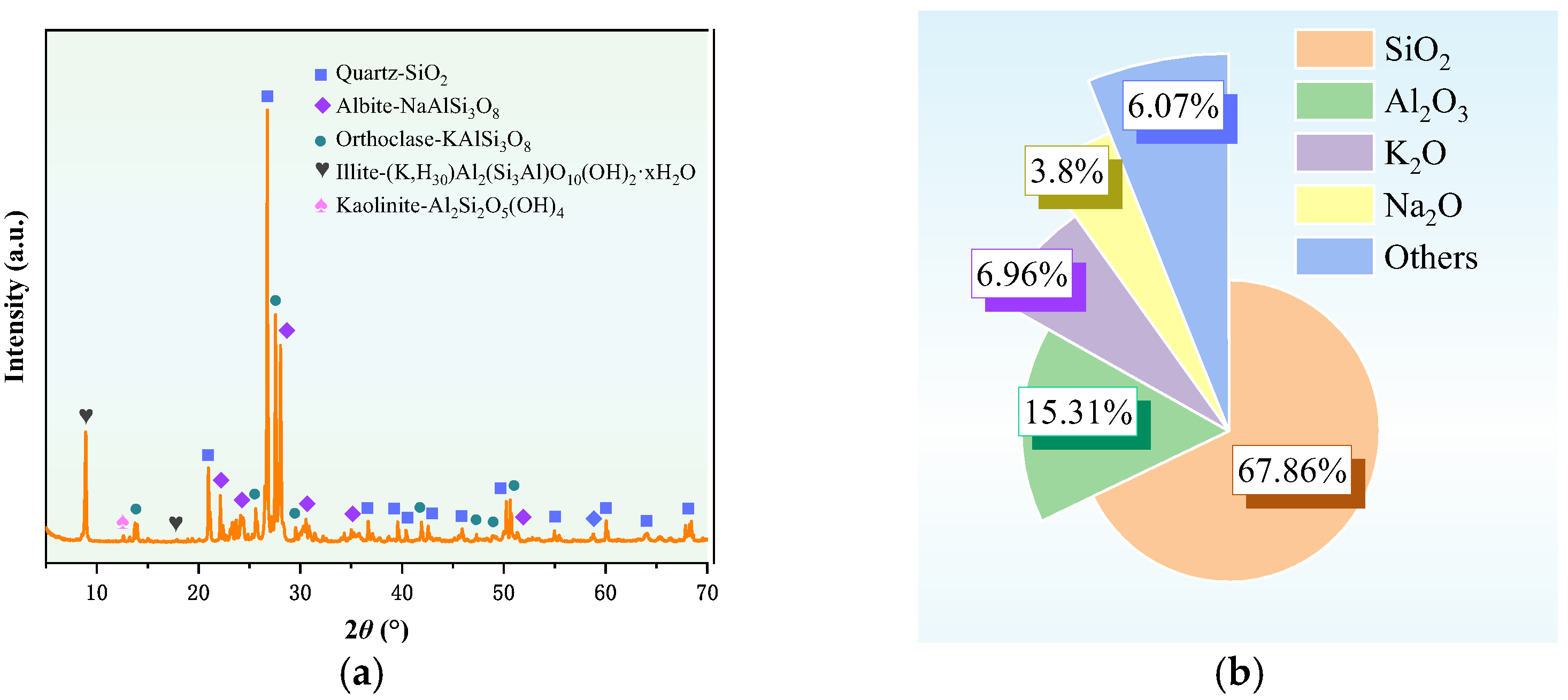 - Strzałkowski, P.; Duchnowska, M.; Bakalarz, A.; Guzik, K.; Ratajczak, T.; Kaźmierczak, U.; Galos, K. Properties of fine-grained rock waste from the production of granite elements in the Strzegom region, Poland—A case study. Physicochem. Probl. Mi. 2025, 61, 204398. [Google Scholar] [CrossRef]