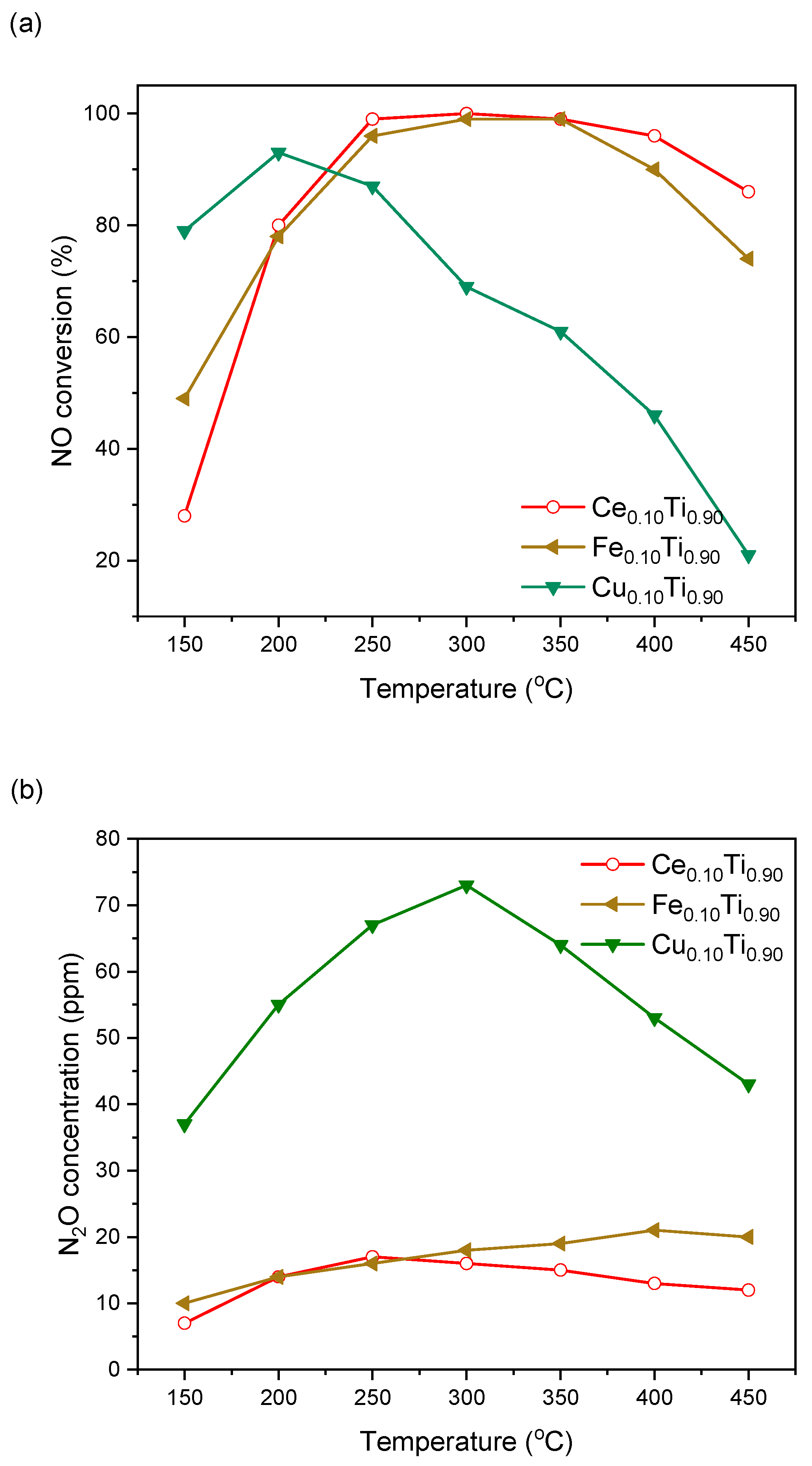 | Ce40/Ti100 | Ce/Ti = 0.4 | 1000 ppm NO, 1000 ppm NH3, 5 vol% O2, He balance | ~80% (T = 250–300 °C) | [5] |