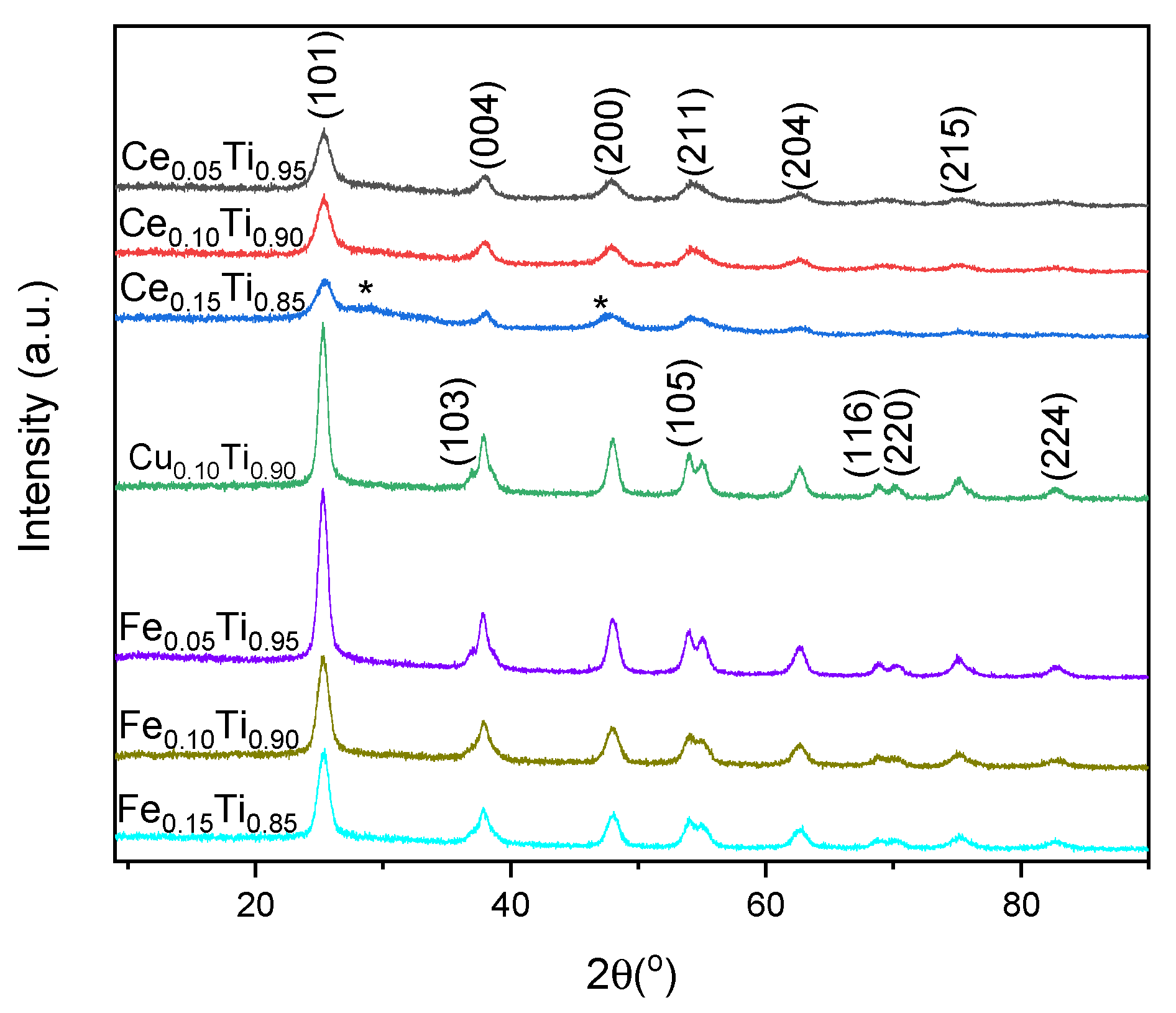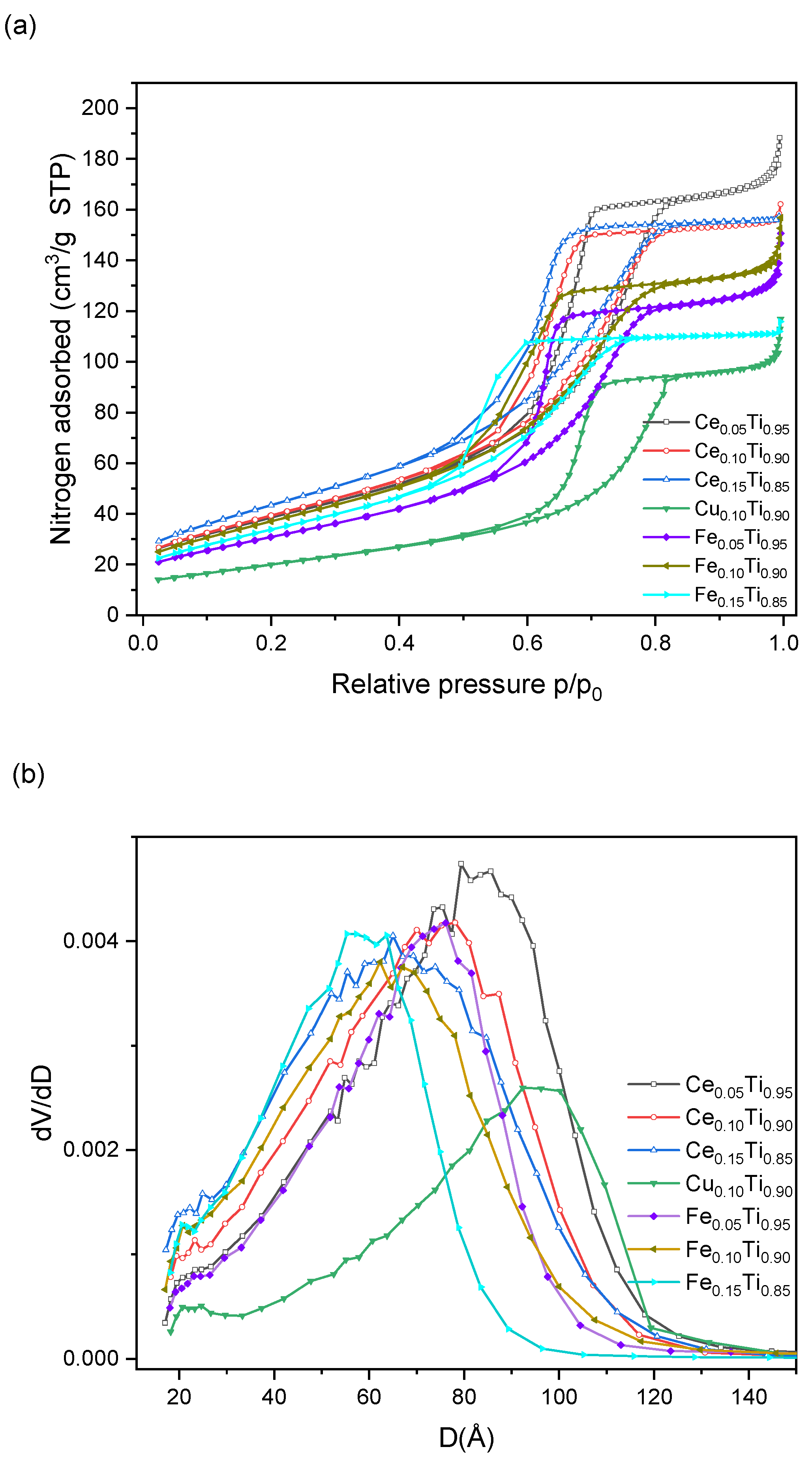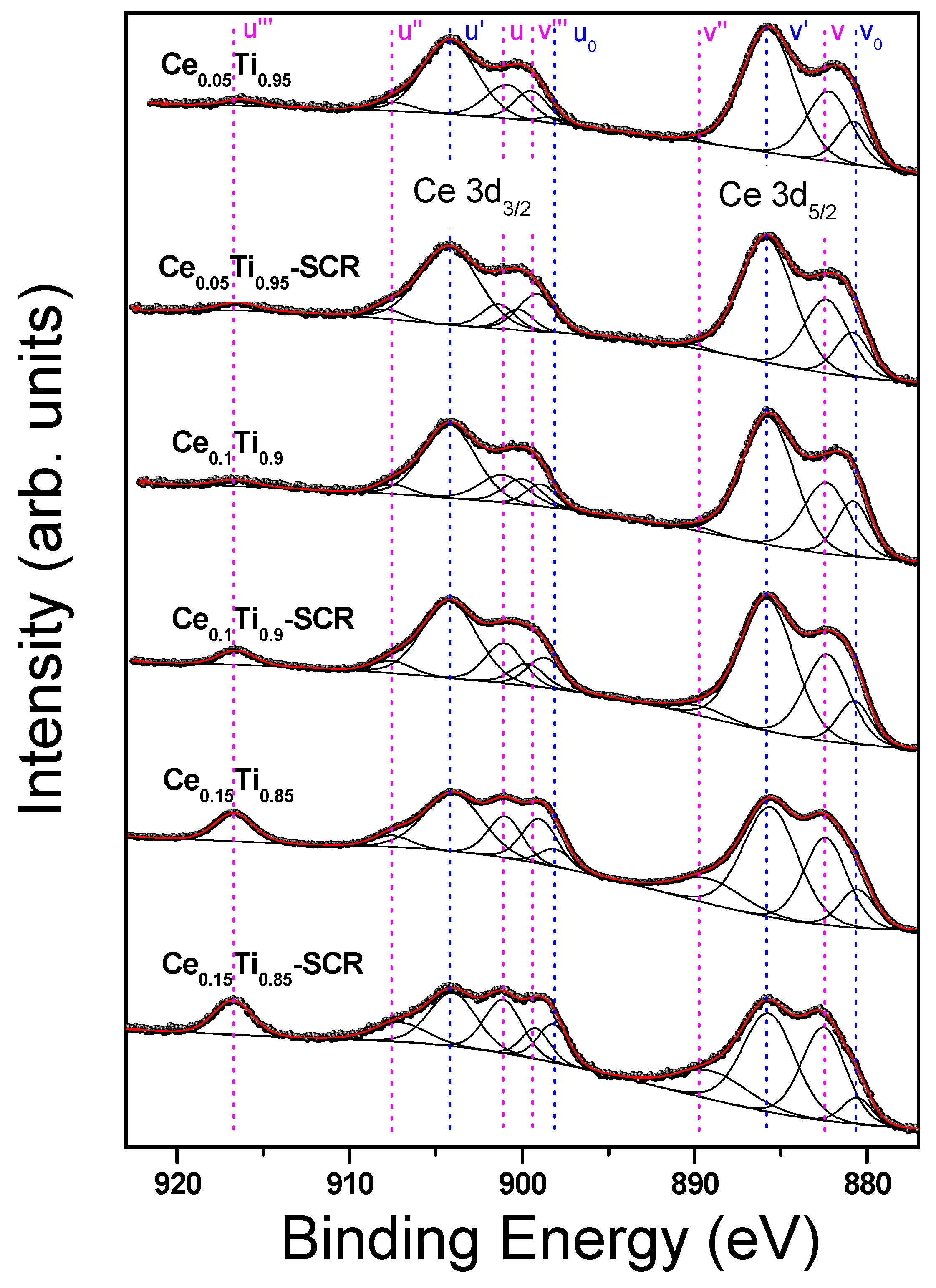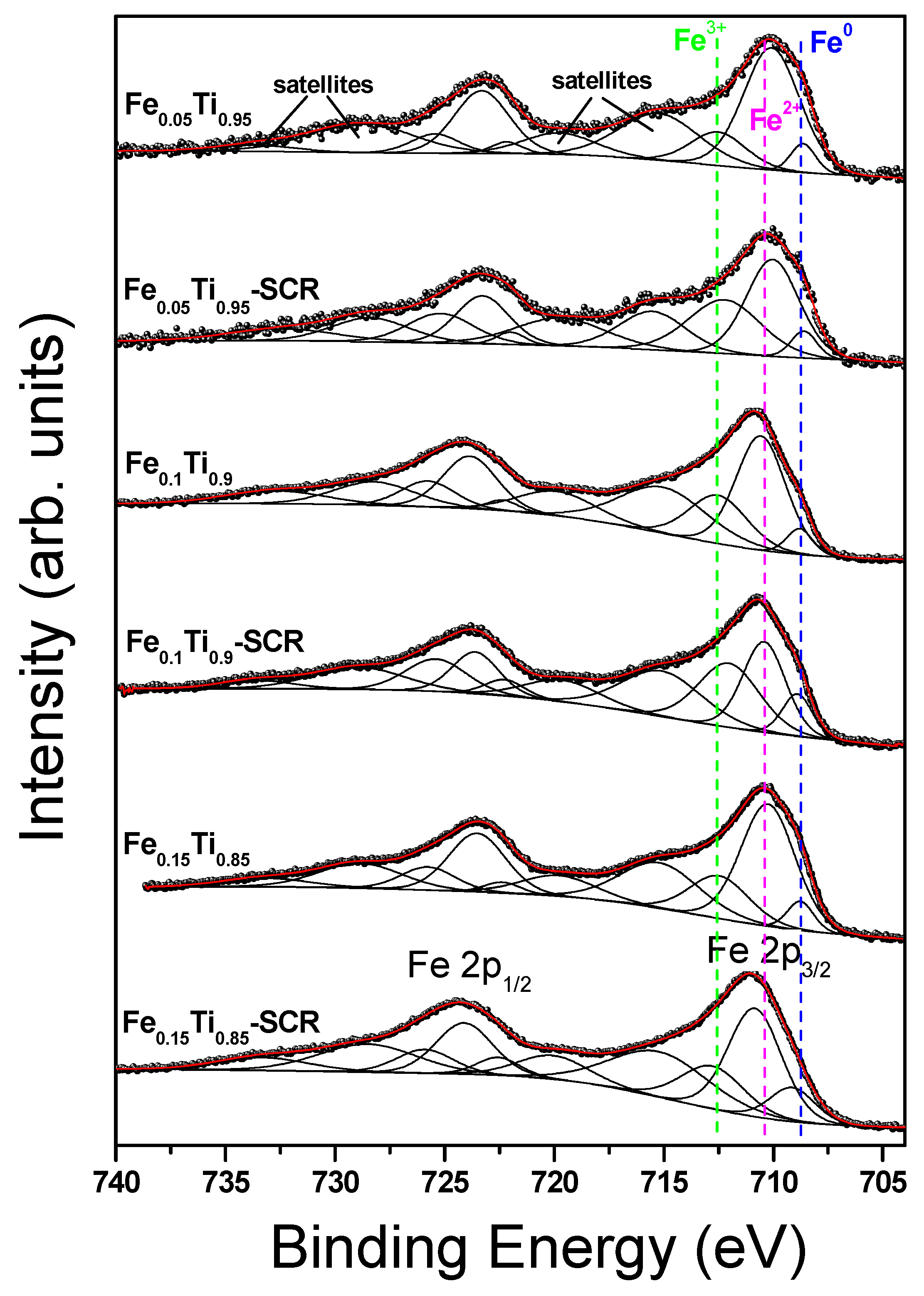 | Fe0.05Ti0.95 Fe0.05Ti0.95-SCR Fe0.10Ti0.90 Fe0.10Ti0.90-SCR Fe0.15Ti0.85 Fe0.15Ti0.85-SCR | 708.6 (7.5) 708.6 (7.2) 708.8 (7.3) 708.9 (14.0) 708.8 (7.7) 709.1 | 710.1 (73.0) 710.0 (52.7) 710.6 (62.2) 710.4 (42.7) 710.3 (66.8) 710.8 | 712.5 (19.5) 712.2 (40.1) 712.5 (30.5) 712.0 (43.3) 712.5 (25.5) 712.8 | 715.2 715.5 715.0 715.1 715.2 715.2 | 719.8 719.7 719.9 719.6 719.8 720.1 | 728.8 728.4 728.2 728.9 728.8 728.5 | 733.6 732.4 732.7 733.6 733.2 733.3 |