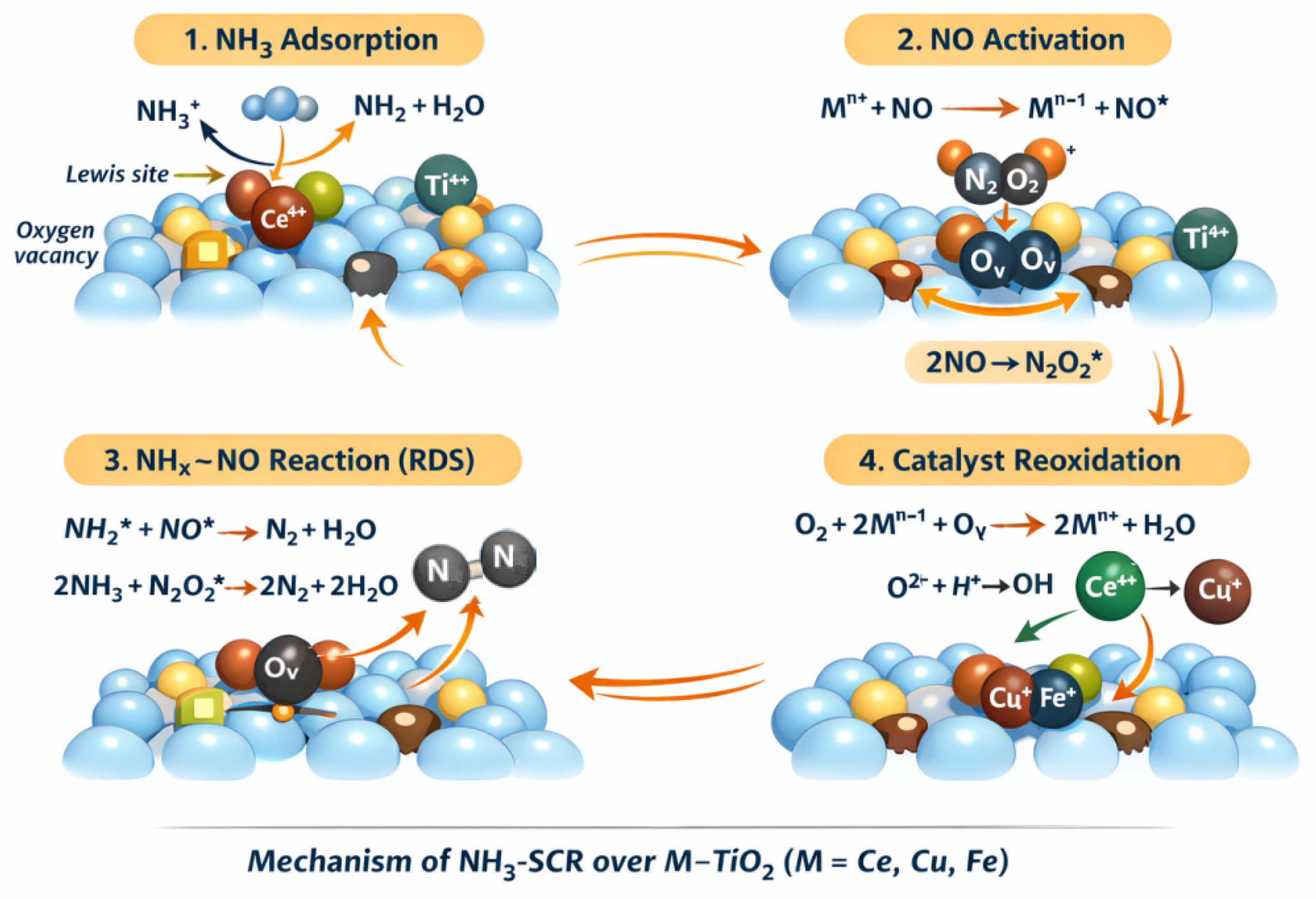 - Liu, B.; Liu, J.; Ma, S.; Zhao, Z.; Chen, Y.; Gong, X.; Song, W. Mechanistic Study of Selective Catalytic Reduction of NO with NH3 on W—Doped CeO2 Catalysts: Unraveling the Catalytic Cycle and the Role of Oxygen Vacancy. J. Phys. Chem. C 2016, 120, 2271–2283. [Google Scholar] [CrossRef]