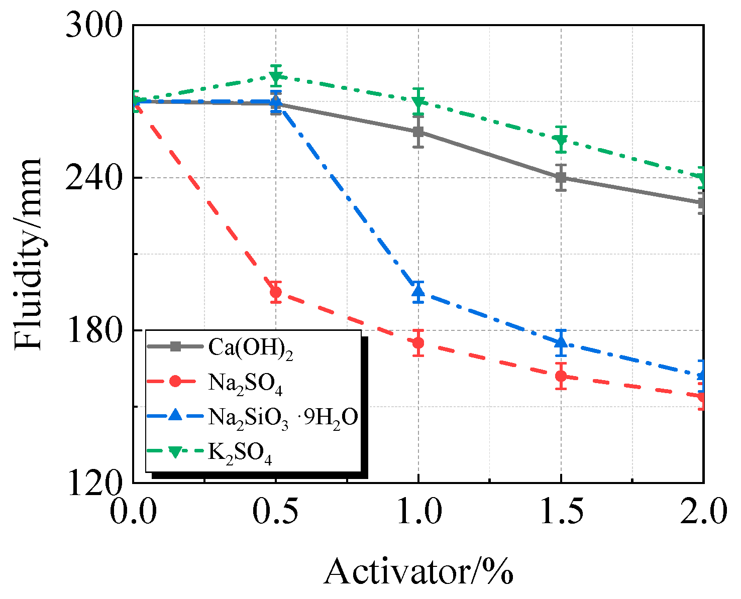 - The activators Ca(OH)2, Na2SO4, Na2SiO3·9H2O, and K2SO4 cause the UHPC containing calcined recycled fine powder to become more viscous and less fluid. Of them, Na2SO4 has the strongest effect and K2SO4 the least; the effects of Ca(OH)2 and Na2SiO3·9H2O are between those of K2SO4 and Na2SO4. Ca(OH)2 can efficiently boost the strength of UHPC; at a dosage of 1.5%, the maximum strength is reached, leading to an 8.8% increase in compressive strength above reference UHPC.