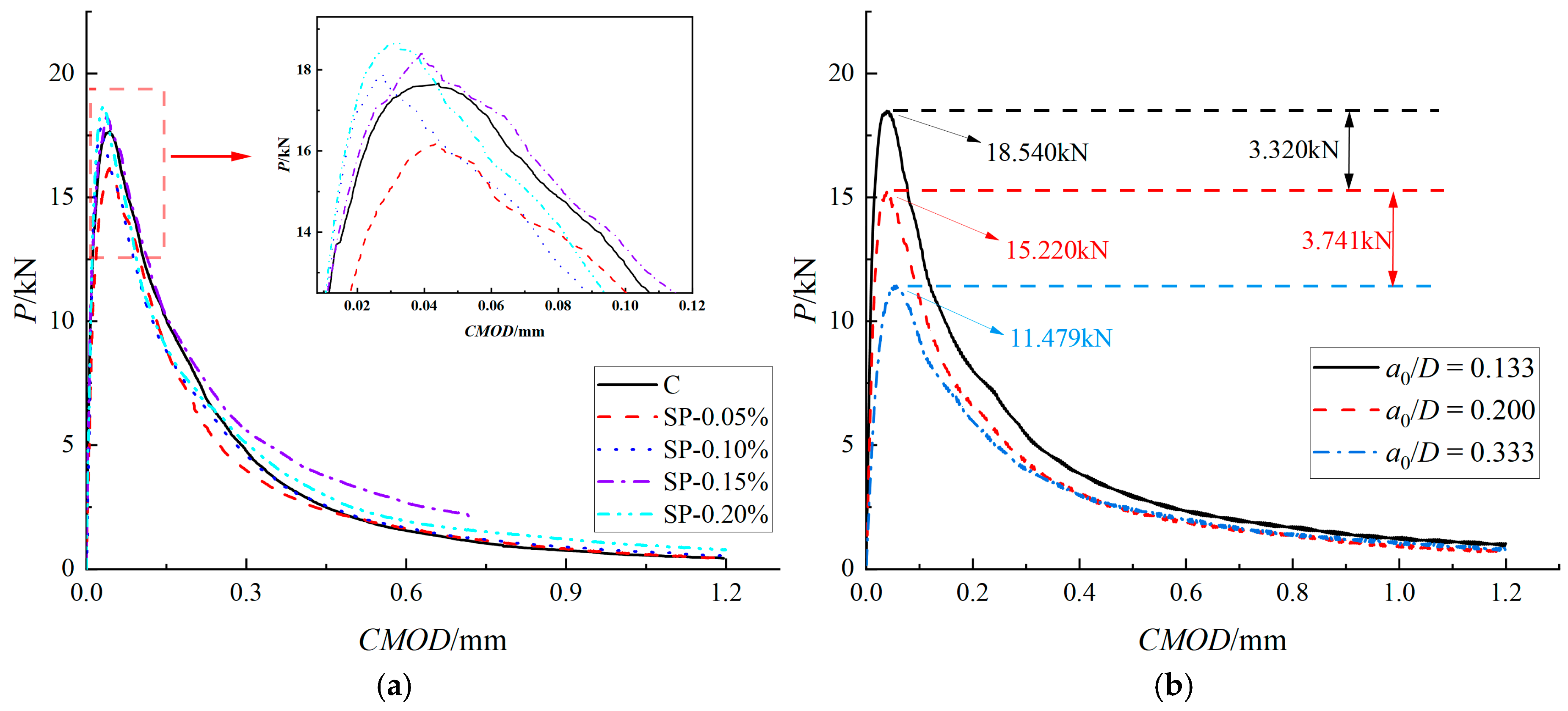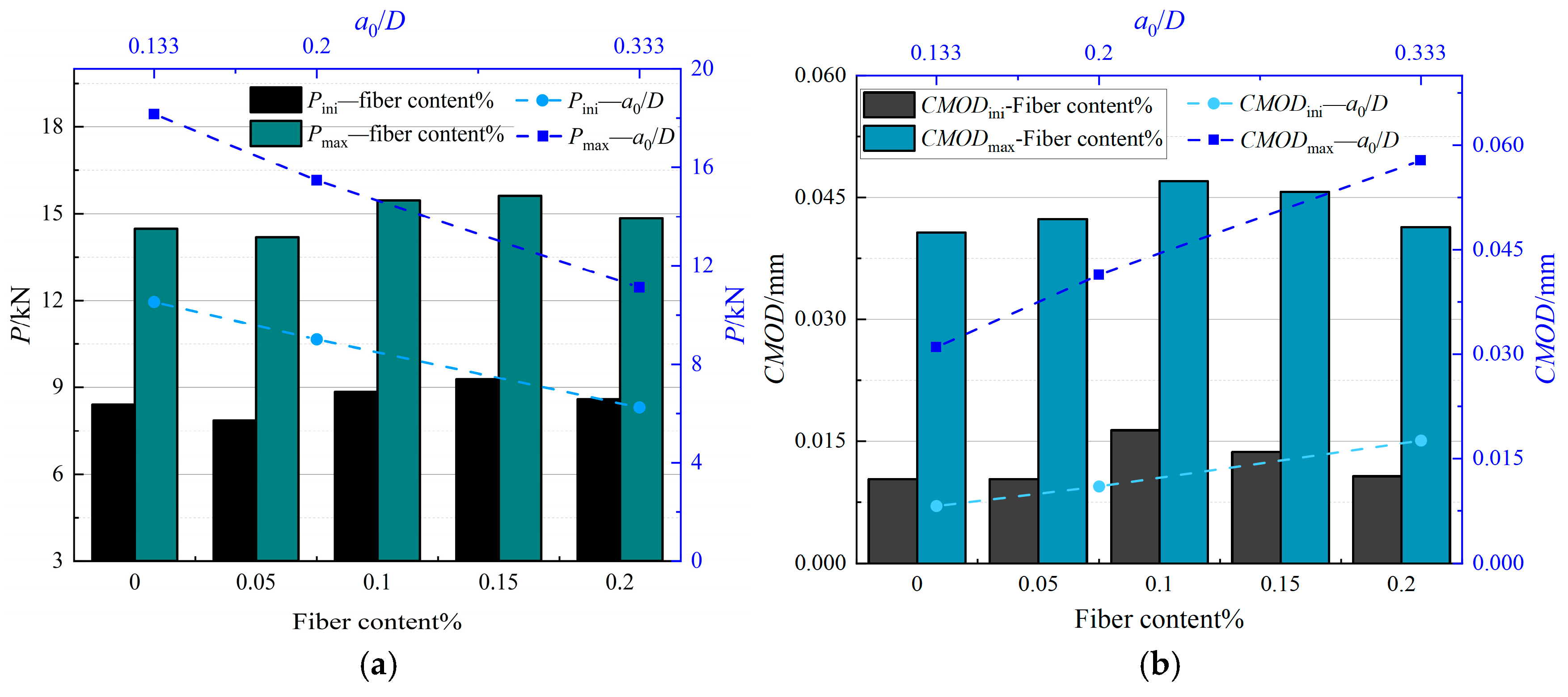 - The P-CMOD curves exhibited substantial variations in shape. Specimens with higher PVA fiber content demonstrated a maximum 14.3% increase in load-bearing capacity, accompanied by gentler post-peak softening behavior due to fiber reinforcement. Larger a0/D significantly reduced the specimens’ load-bearing capacity and failure deformation by an average of 22%, while simultaneously increasing the crack mouth opening displacement (CMOD) at critical states.