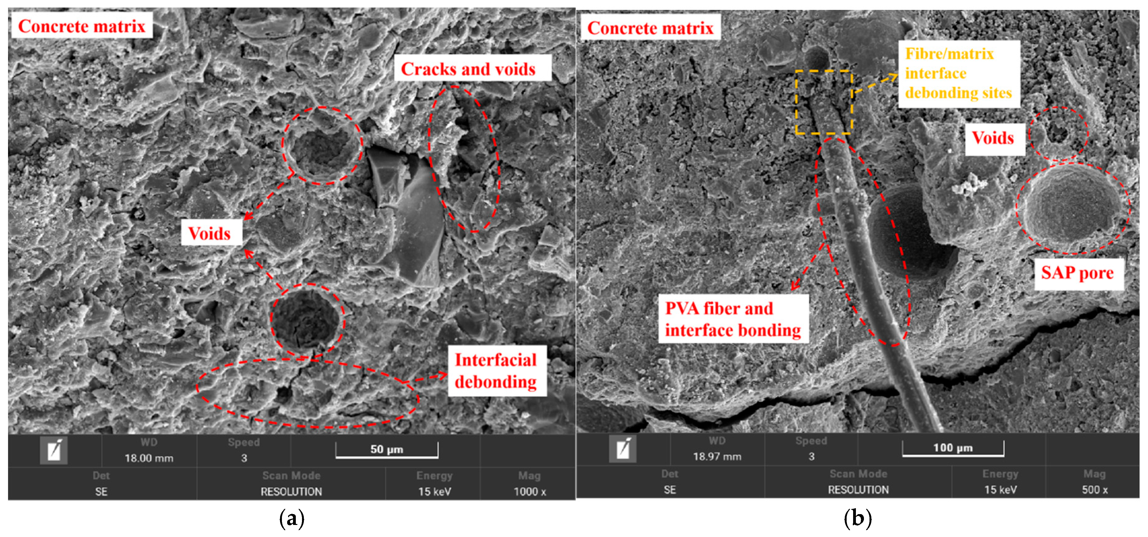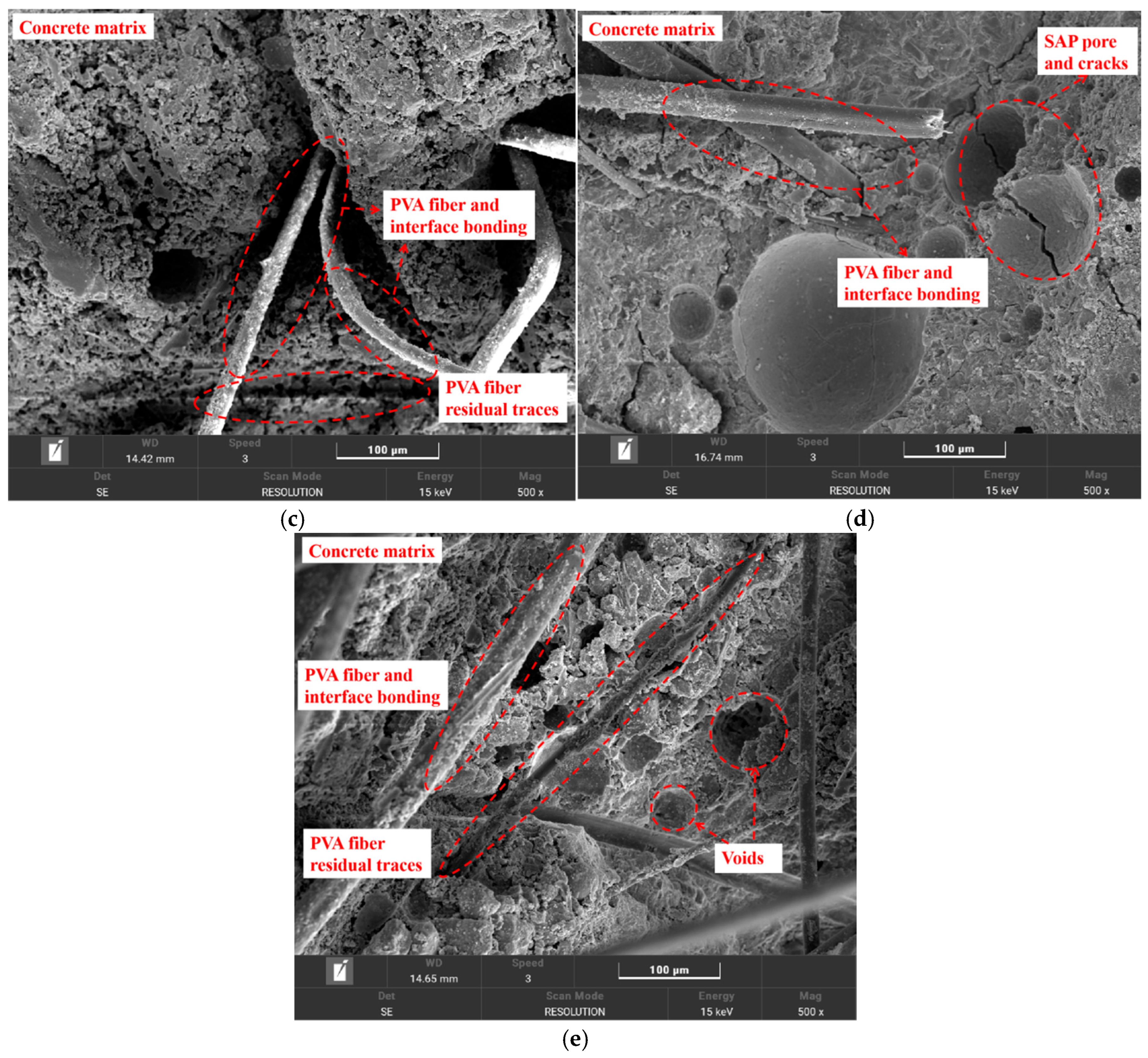 - SEM-based microstructural analysis revealed that while SAP and PVA fibers objectively increased the incidence of initial defects in the concrete matrix, their synergistic coupling bridging effect enhanced interfacial bonding properties, demonstrating a positive role in toughening and crack resistance for SAP-PVAC specimens. However, this study has limitations regarding the characterization of microscopic fracture mechanisms in these specimens. Further research is required to quantify the micro-interfacial properties of SAP-PVAC composites, such as through nanoindentation or spectroscopic imaging techniques.