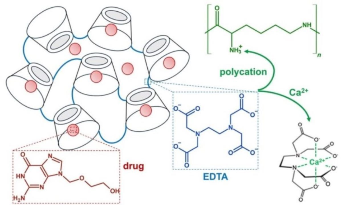 Investigated PCDs demonstrated a remarkable multifunctionality, effectively engaging in interactions with small-molecule drugs, divalent ions, and oppositely charged polymers. This unique convergence of functionalities that positions them as promising platforms for advanced drug delivery and biomaterial design. Their cyclodextrin cavities enable inclusion-based solubilization of small molecules, while the EDTA moieties introduce an intrinsic ion sensitivity that can modulate particle size, charge, and as a result possibly drug retention in response to biologically relevant cations. Furthermore, their polyanionic nature allows controlled self-assembly with complementary polymers, opening opportunities for constructing multilayer coatings, hybrid hydrogels, or ion-responsive delivery matrices. Taken together, these combined features enable multifunctional behavior within a single carrier—drug complexation, ion-triggered structural transitions, and polyelectrolyte assembly—which can be leveraged to engineer smart, environmentally responsive therapeutic systems.