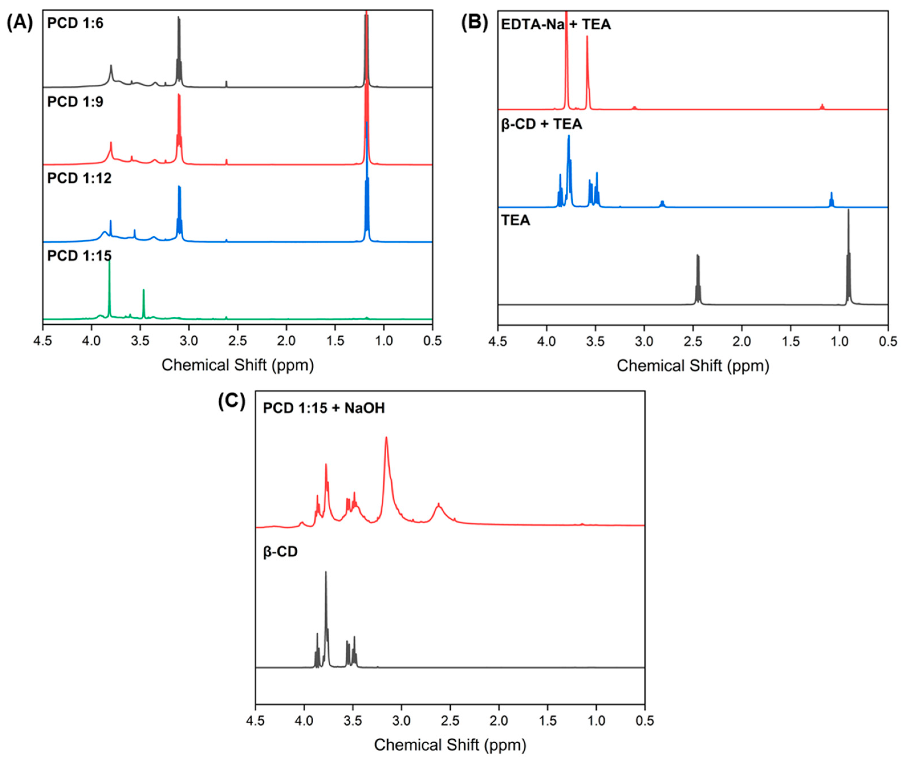 Samples included β-CD, PCD 1:12, and PCD 1:15 (9 mg/mL) as well as EDTA-Na, PCD 1:6, and PCD 1:9 (15 mg/mL). For hydrolysis experiments, a small amount of NaOH was added to PCD 1:15 several hours before measurement. For TEA–PCD interaction studies, TEA was added at 10 mg/mL, and β-CD and EDTA-Na were also combined with TEA at a 1:1 molar ratio.