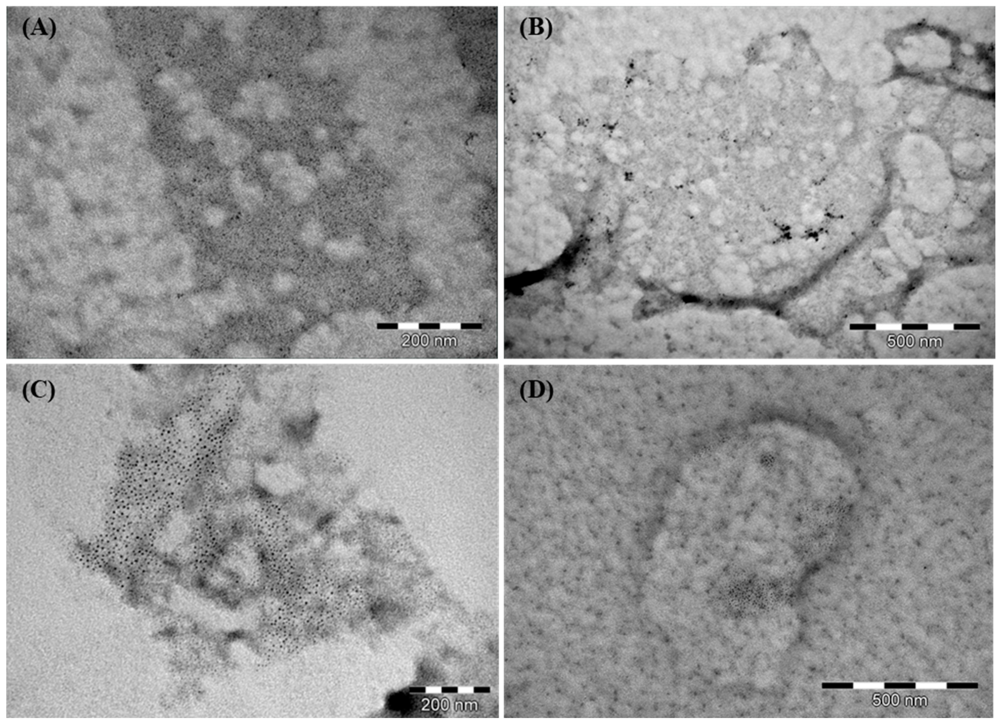 Prior to TEM imaging, the hydrophobic Formvar surface was first hydrophilized and then coated with the positively charged polyelectrolyte PLL. This step was essential to retain the PCD nanoparticles on the grid during rinsing and staining. The PLL layer provided a positively charged surface that effectively captured the anionic PCDs and enhanced image contrast. In the TEM images (