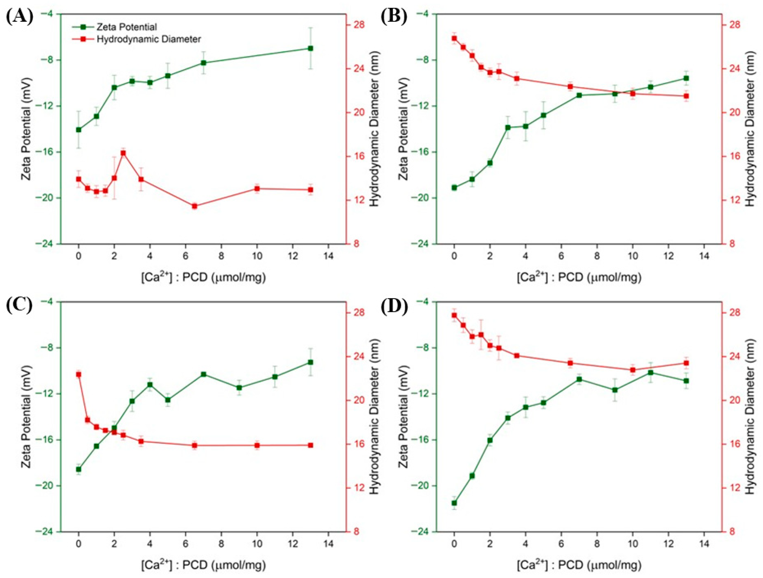 The interaction of PCDs with calcium ions was evaluated by titration of PCD solutions (2.5 mg/mL in 0.1 M Tris-HCl) with 0.1 M CaCl2 prepared in the same buffer. The titrant was added incrementally until a final Ca2+-to-PCD mass ratio of 13.0 µmol/mg was reached. Hydrodynamic diameter values were averaged from at least four measurements, and zeta potential values from three measurements.