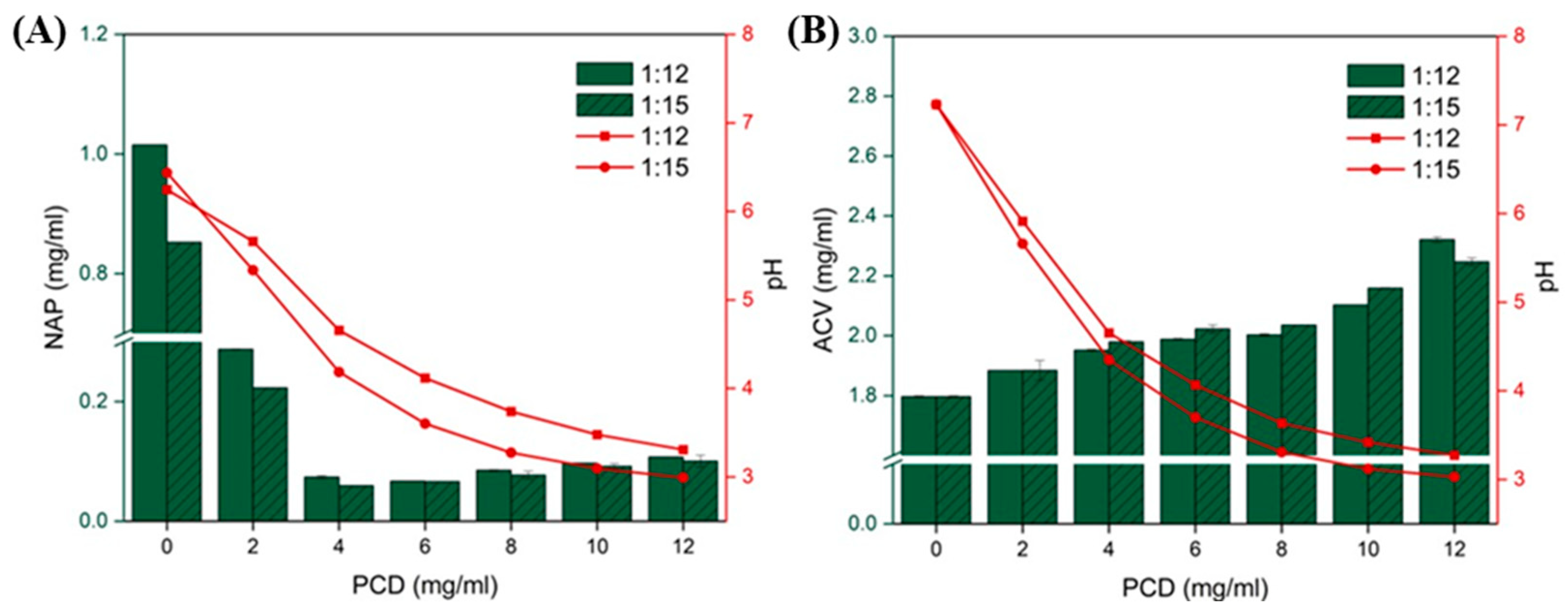 20]. Excess drug (25 mg ACV or 7.5 mg NAP) was added to test tubes containing 5 mL of 1: 12 or 1:15 PCD solutions in PBS (pH 7.4) at concentrations ranging from 0.0 to 12.0 mg/mL. NAP was obtained by acidifying its sodium salt with concentrated HCl. Suspensions were sonicated for 5 min, then shaken at 200 rpm at room temperature for 72 h to reach equilibrium. After centrifugation (15,000 rpm, 15 min), supernatants were diluted as needed, and drug concentrations were quantified by HPLC. Phase solubility diagrams were constructed by plotting dissolved drug concentration against PCD concentration.
