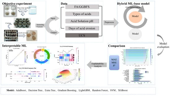 This study employed machine learning to investigate the mechanical behavior of one-part geopolymer (OPG)-stabilized soil subjected to acid erosion. Based on the unconfined compressive strength (UCS) data of acid-eroded OPG-stabilized soil, eight machine learning models, namely, Adaptive Boosting (AdaBoost), Decision Tree (DT), Extra Trees (ET), Gradient Boosting (GB), Light Gradient Boosting Machine (LightGBM), Random Forest (RF), Support Vector Machine (SVM), and eXtreme Gradient Boosting (XGBoost), along with hyper-parameter optimization by Genetic Algorithm (GA), were used to predict the degradation of the UCS of OPG-stabilized soils under different durations of acid erosion. The results showed that GA-SVM (R2 = 0.9960, MAE = 0.0289) and GA-XGBoost (R2 = 0.9961, MAE = 0.0282) achieved the highest prediction accuracy. SHAP analysis further revealed that solution pH was the dominant factor influencing UCS, followed by the FA/GGBFS ratio, acid-erosion duration, and finally, acid type. The 2D PDP combined with SEM images showed that the microstructure of samples eroded by HNO3 was marginally denser than that of samples eroded by H2SO4, yielding a slightly higher UCS. At an FA/GGBFS ratio of 0.25, abundant silica and hydration products formed a dense matrix and markedly improved acid resistance. Further increases in FA content reduced hydration products and caused a sharp drop in UCS. Extending the erosion period from 0 to 120 days and decreasing the pH from 4 to 2 enlarged the pore network and diminished hydration products, resulting in the greatest UCS reduction. The results of the study provide a new idea for applying the ML model in geoengineering to predict the UCS performance of geopolymer-stabilized soils under acidic erosion.