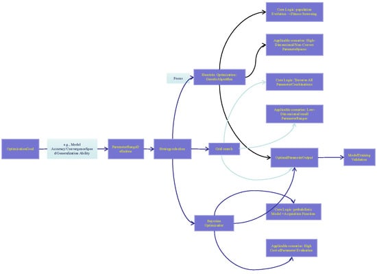 The preceding results demonstrated that there existed a significant non-linear relationship between the variables. Although the polynomial model outperformed linear models, its representational capacity was still limited. For this reason, this study further investigated eight non-linear algorithms, namely ET, DT, RF, AdaBoost, LightGBM, GBT, SVM, and XGBoost. To ensure a fair comparison, the hyper-parameters of these algorithms were fine-tuned following the parameter optimization workflow illustrated in Figure 6. The workflow takes “model accuracy/convergence speed/generalization ability” as the optimization objectives (corresponding to the Optimization Goal module in the figure). It first defines the parameter range (the Parameter Range Definition module), and then selects optimization strategies (including grid search, Bayesian optimization, etc., corresponding to the Strategy Selection module). In this study, we focused on the Genetic Algorithm (GA)—this algorithm is suitable for high-dimensional/non-convex parameter spaces (matching the non-linear variable relationship in this study, corresponding to GA’s Applicable Scenarios in the figure), with its core logic being “population evolution + fitness screening” (corresponding to GA’s Core Logic in the figure). After the optimal parameters are obtained through this workflow (the Optimal Parameter Output module), model training and validation can be carried out, which correspond to the Model Training Validation module at the end of the figure. The model parameters optimized via GA are shown in Table 4.