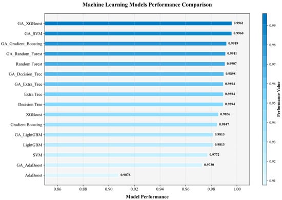 The first part was to obtain data through experiments, which served as the source of the entire model training data. It is noted that the experimental data were obtained from the related tests conducted by our research group [20,49]. The second part was the data preprocessing phase. In this study, a multi-dimensional preprocessing procedure was systematically implemented to ensure data quality: first, categorical variables in the dataset were numerically converted using One-Hot Encoding to enable recognition of non-numerical features by machine learning models; second, a small amount of missing data (missing rate < 1%) was handled via mean imputation to avoid model training biases caused by data gaps; finally, all variables were normalized across each dimension to reduce potential biases introduced by measurement errors—specifically, min–max scaling was adopted to standardize all variables to the interval [0, 1], and the transformation is given by Equation (10). The third part focused on model development, in which 80% of the preprocessed data were allocated to the training set to construct and train 16 machine learning regressors: AdaBoost, Decision Tree, Extra Trees, Gradient Boosting, LightGBM, Random Forest, XGBoost, and SVM, together with their Genetic Algorithm-optimized variants. The fourth part employed the remaining 20% as the test set and evaluated all models using three performance metrics. The two top-performing models were then subjected to SHAP- and PDP-based interpretability analysis to elucidate their prediction mechanisms and validate feasibility.