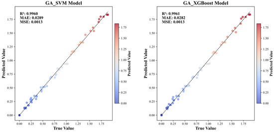 - Genetic Algorithm optimization significantly enhanced the prediction accuracy of the ML models. Before optimization, the Random Forest and Decision Tree models already exhibited high prediction accuracy, with R2 values of 0.9907 and 0.9894, respectively. After optimization, GA-XGBoost slightly outperformed GA-SVM (R2 = 0.9961 vs. 0.9960; MAE = 0.0282 vs. 0.0289).