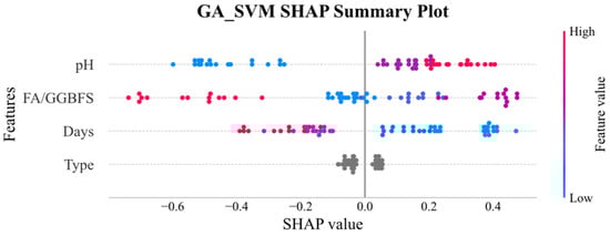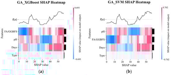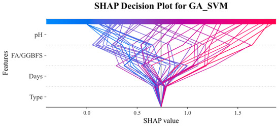 The SHAP decision diagram visualized how the SHAP values of each feature collectively influenced the final prediction. The color transition from blue (indicating low feature values) to red (indicating high feature values) reflected the change in feature values. The wide distribution of SHAP values for the acid solution pH and FA/GGBFS features in both models suggested that changes in the feature values across samples had a significant impact on the model output.