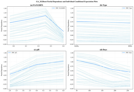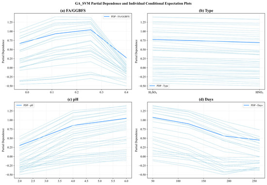 Figure 16 and Figure 17 present the PDP (hidden lines) and ICE (light lines) results for GA-SVM and GA-XGBoost, respectively, across the four key features: FA/GGBFS, type of acid, acid solution pH, and days of acid erosion. Each subplot showed how varying a single feature (while holding the others fixed) affected the predicted UCS, exposing both the average marginal response (PDP) and the heterogeneity among individual samples (ICE).