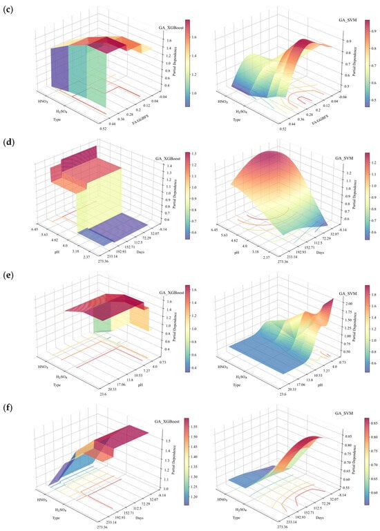 2D PDP analysis under acidic erosion (based on GA-XGBoost with a GA-SVM model): (a) FA/GGBFS vs. days of acid erosion; (b) FA/GGBFS vs. acid solution pH; (c) FA/GGBFS vs. types of acids; (d) days of acid erosion vs. acid solution pH; (e) acid solution pH vs. type of acids; and (f) days of acid erosion vs. type of acids.