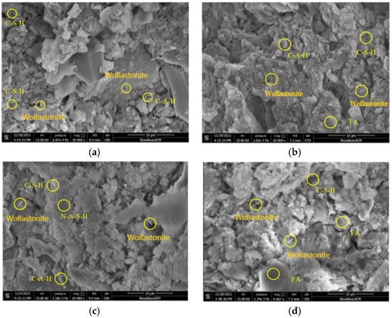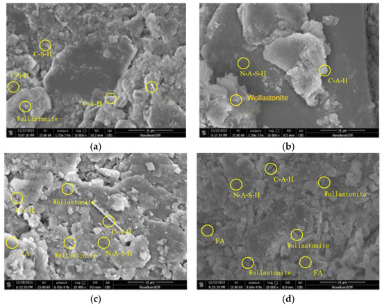 SEM results of stabilized soil with different FA/GGBFS after 60 days of erosion in H2SO4 solution at pH 4: (a) FA/GGBFS = 0; (b) FA/GGBFS = 0.11; (c)FA/GGBFS = 0.25; and (d) FA/GGBFS = 0.43.