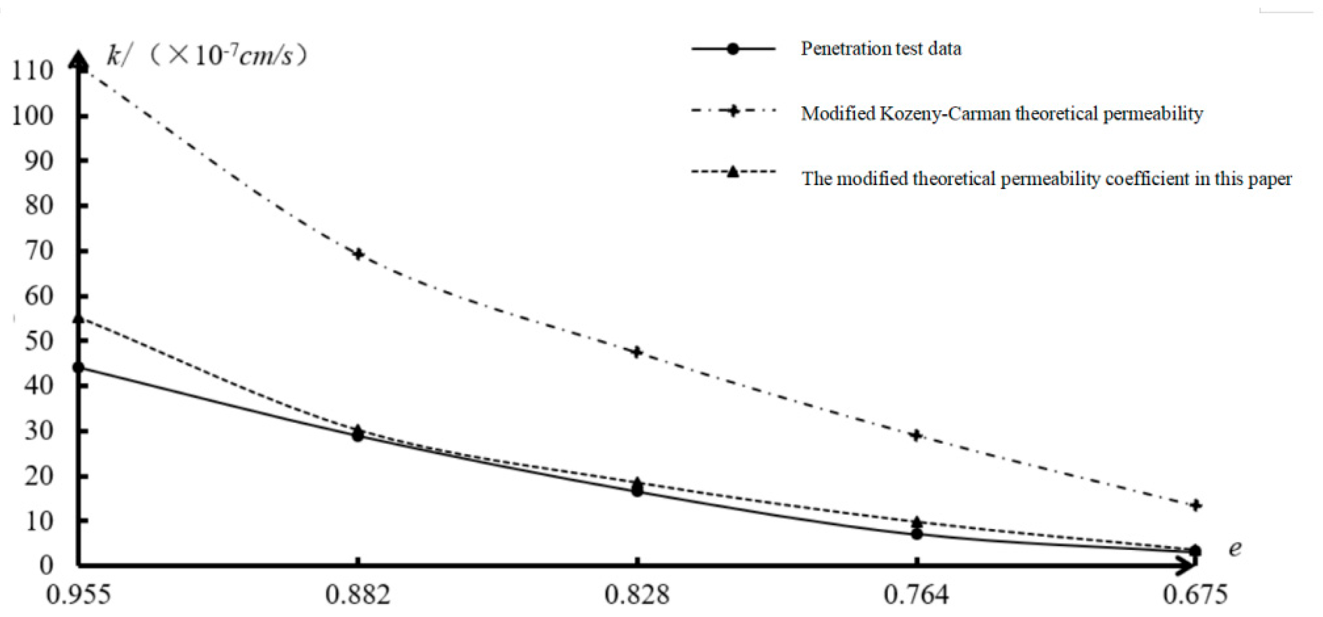 | Modified Kozeny–Carman Theoretical permeability coefficient/(×10−7 cm/s) | 110.964 | 69.306 | 47.429 | 29.054 | 13.442 |