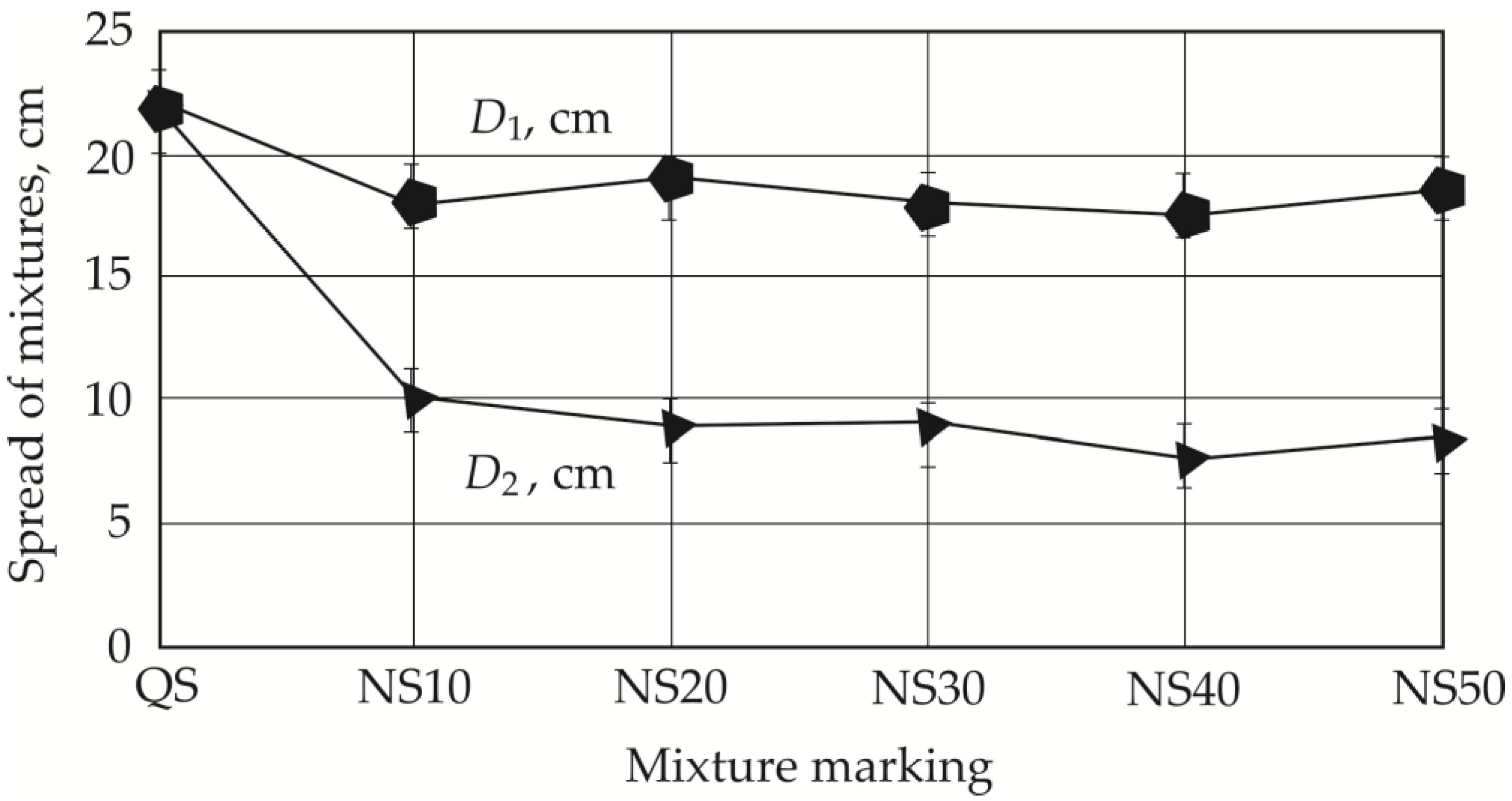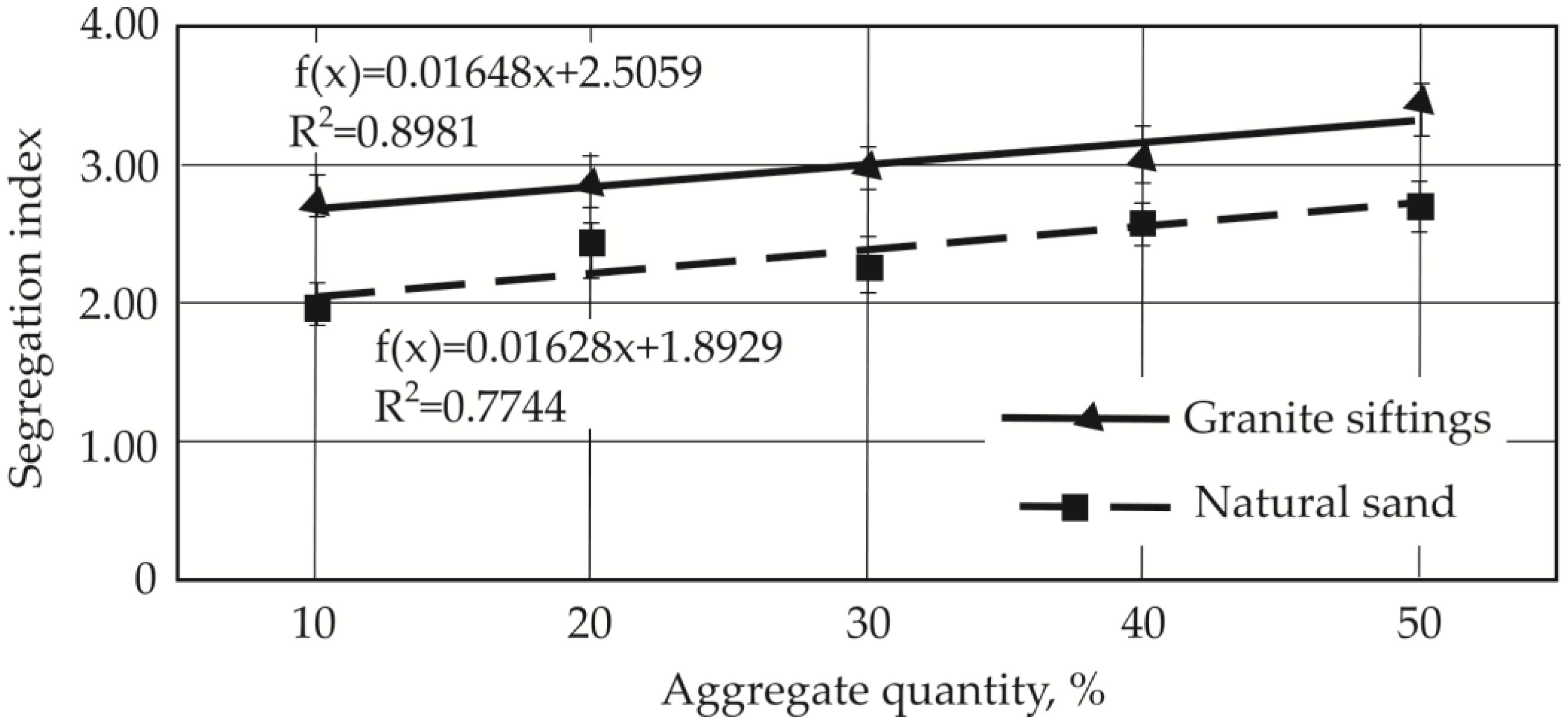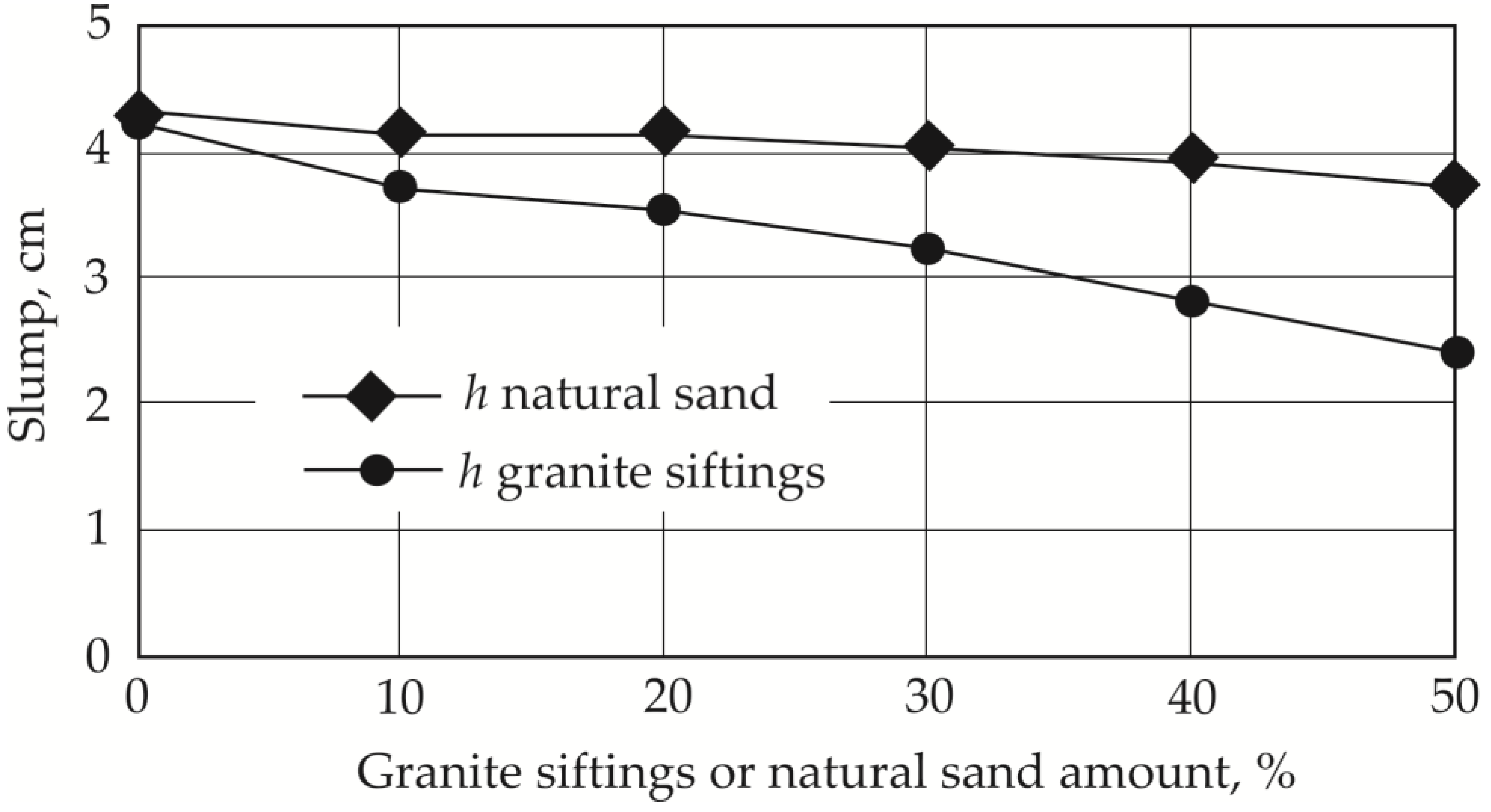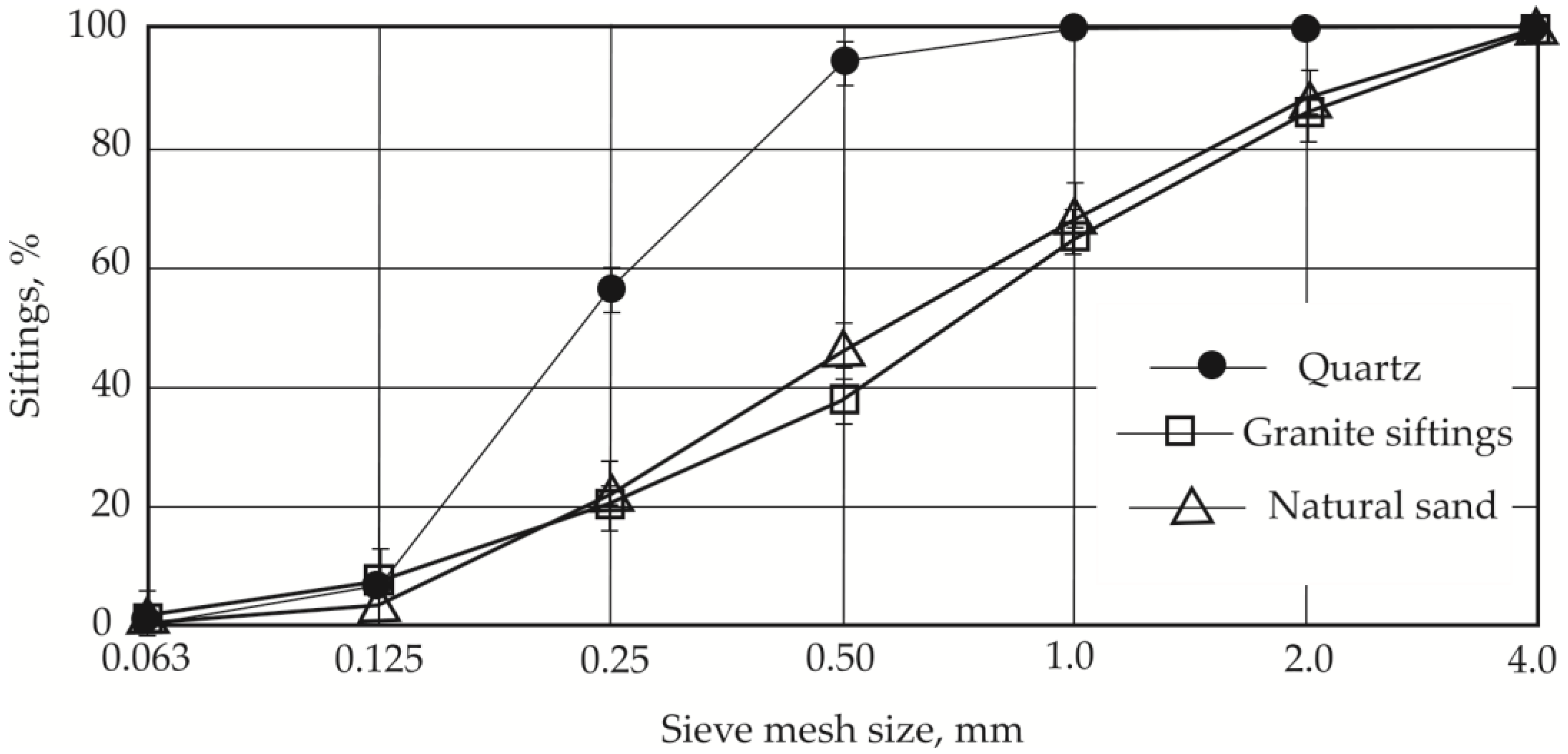- The possibility of using granite siftings or natural sand instead of quartz sand has been investigated. These aggregates have different physical surface characteristics that significantly affect the consistency of concrete mixtures. Therefore, in the future, when using fine aggregates with different surface parameters, different methods of mixture compaction must be applied, taking into account the possibility of segregation.