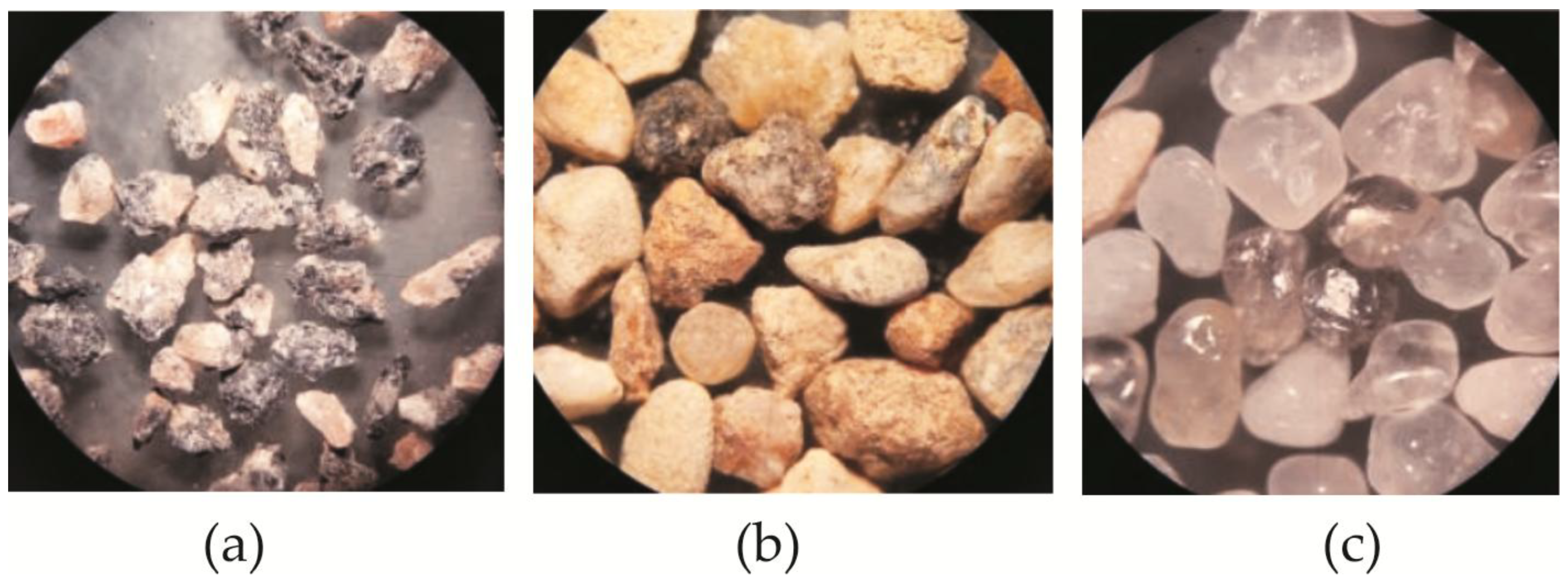 - Krumbein, W.C. Measurement and geological significance of shape and roundness of sedimentary particles. J. Sediment. Res. 1941, 11, 64–72. [Google Scholar] [CrossRef]