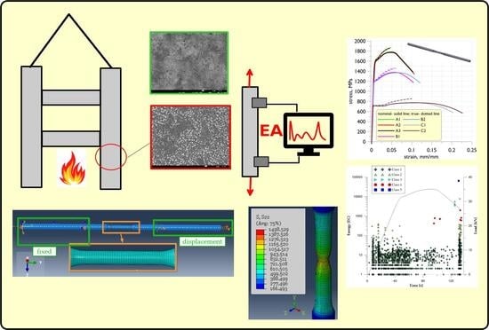 The novelty of this work lies in the coordinated application of microstructural analysis, mechanical testing, acoustic emission monitoring, and numerical verification (FEM) to evaluate degradation mechanisms in prestressing steel subjected to high temperature. For the first time, AE parameters (Counts to Peak and RA-value) were correlated with local FEM-derived plastic strains ε22 and von Mises equivalent stresses, allowing unambiguous identification of the transition from a quasi-brittle to a ductile failure mechanism. This integrated methodology links microstructural processes with the macroscopic mechanical response and provides the foundation for a quantitative, AE-based diagnostic criterion for assessing the condition of prestressing elements after fire exposure.