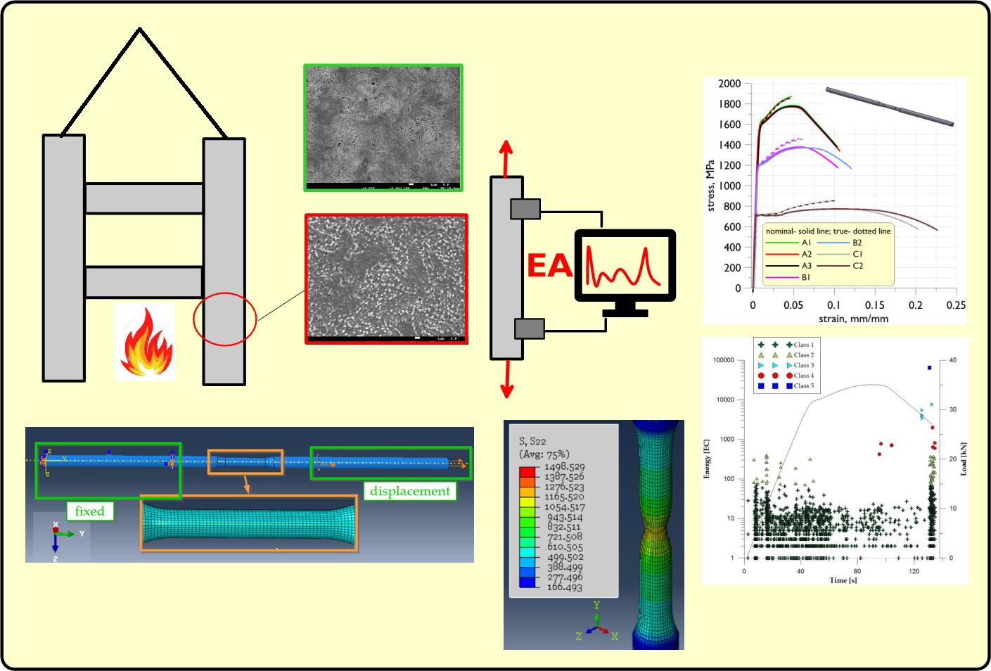 Figure 1). In the first stage, the focus was placed on identifying microstructural changes occurring in prestressing steel under high-temperature conditions corresponding to fire exposure. The second stage involved the assessment of strength properties and the analysis of AE signals during tensile tests, which made it possible to determine the relationships between microstructural parameters, material behaviour, and acoustic emission activity. The third stage, based on numerical analysis, enabled the correlation of the mechanical response of the specimens with the development of damage.