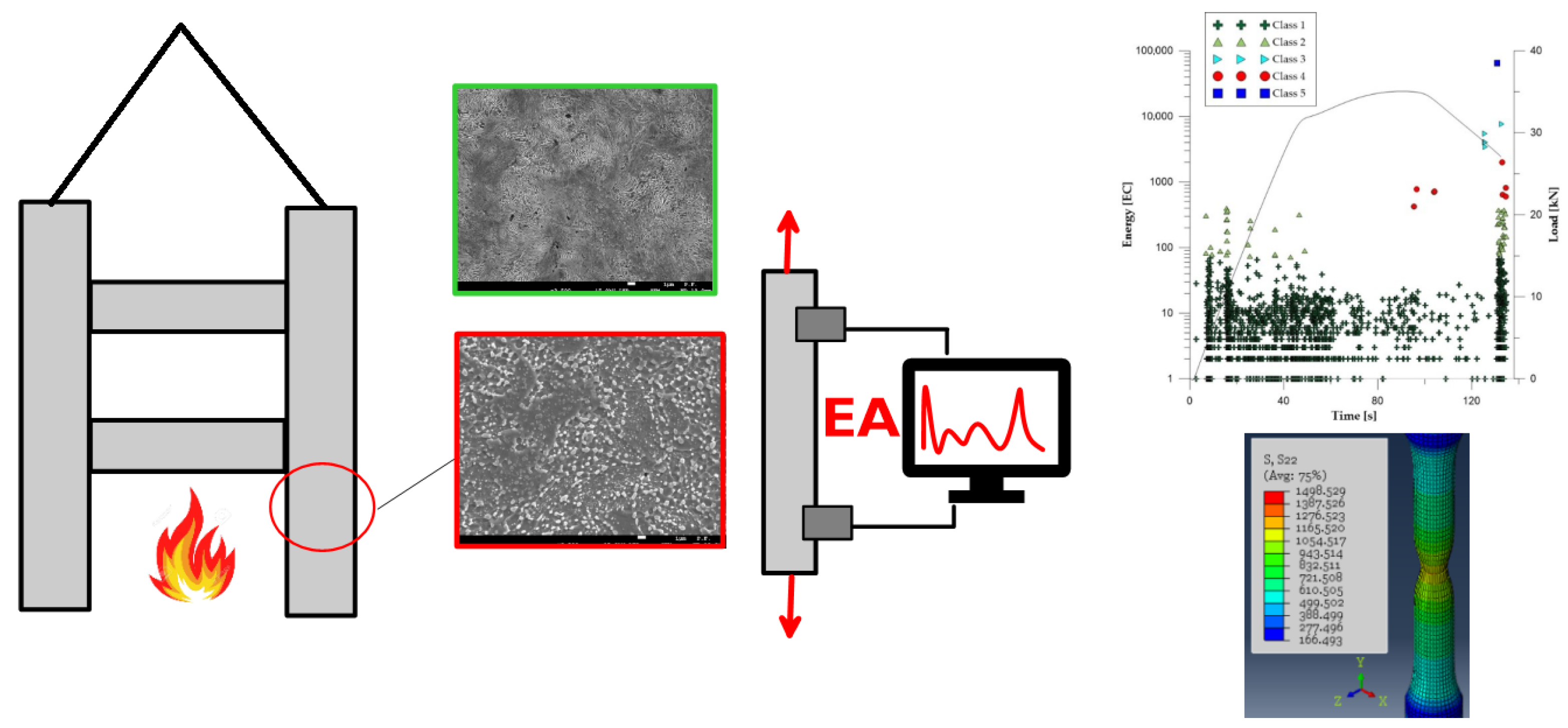 First-time correlation of AE parameters with FEM-derived strain and stress fields, enabling objective identification of the onset of damage and strain localization in fire-exposed prestressing steel;