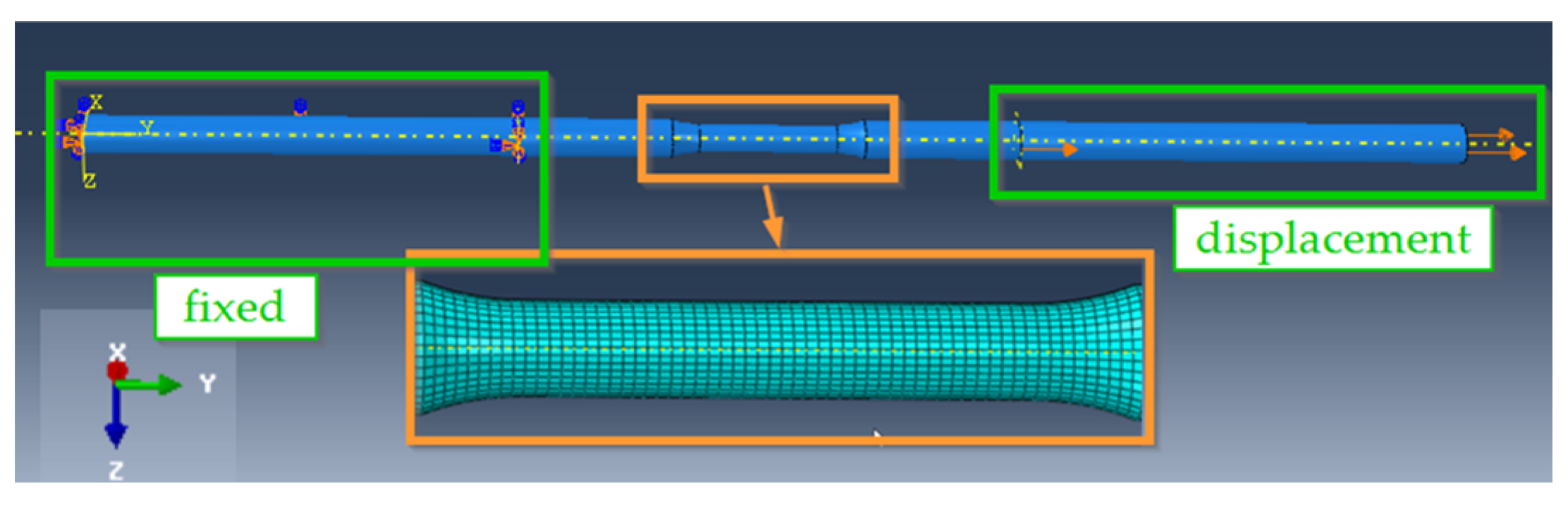 ε22 was used because it represents the dominant deformation mode in uniaxial tension and directly reflects strain localisation in the necking region. The von Mises equivalent stress was selected as a scalar measure of the overall stress state, allowing consistent comparison with AE activity and experimental observations. In order to ensure reliable results from numerical simulations, proper preparation of the model must be taken care of. Important steps are the mapping of the geometry of the specimen or component being analysed, the correct definition of boundary conditions, the development of a high-quality finite element (FE) mesh and the correct preparation of the material model. The preparation of the material model, i.e., the relationship between true stresses and strains, requires particular attention and work [