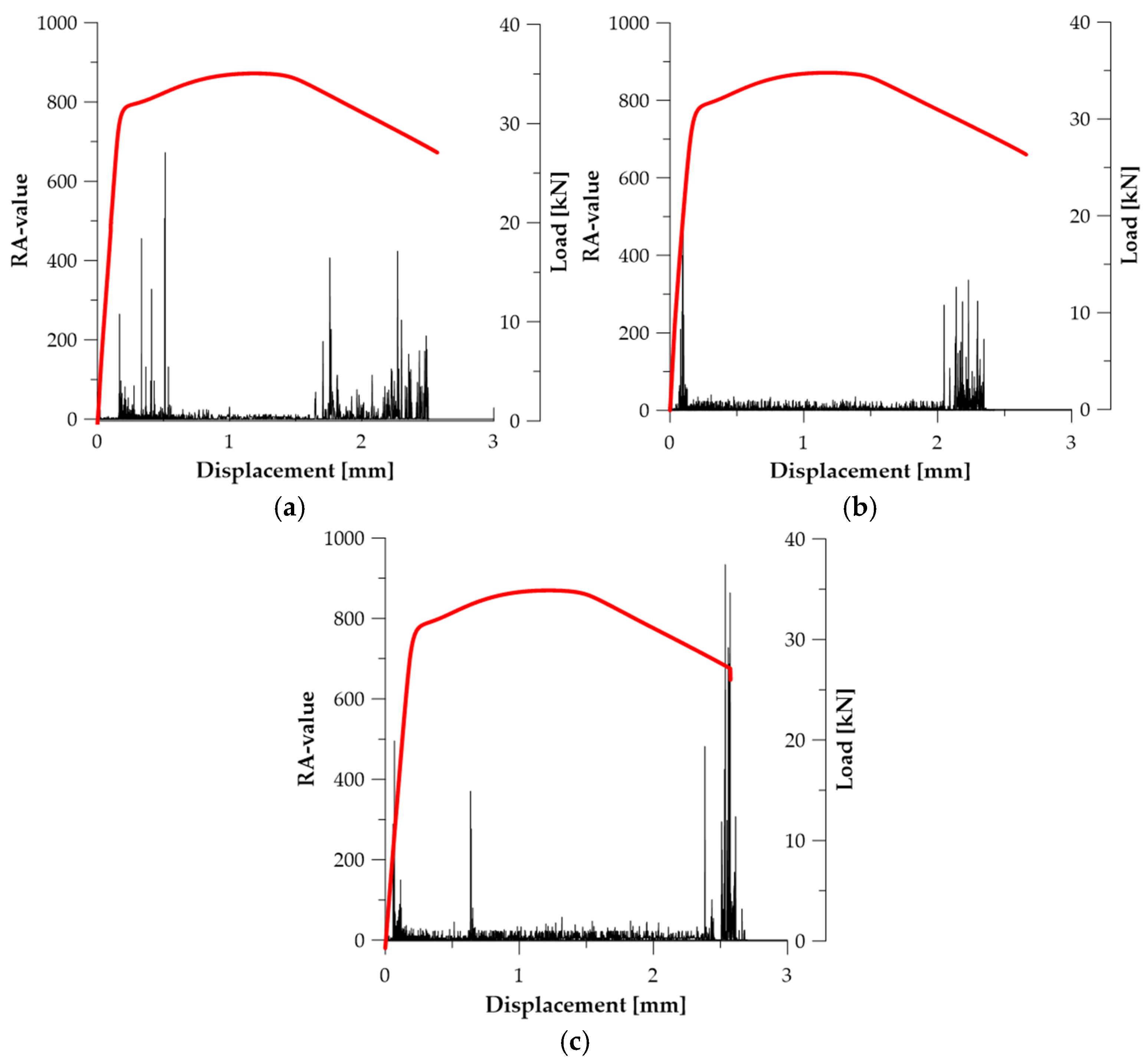 The parameters chosen for analysis were “Counts to Peak” because it reflects the cumulative AE activity associated with the onset of strain localization, and the “RA value” parameter, commonly used to distinguish between sudden (quasi-brittle) and gradual (ductile) deformation mechanisms. These two parameters therefore provide complementary information, enabling the identification of the transition from uniform plasticity to localised failure.