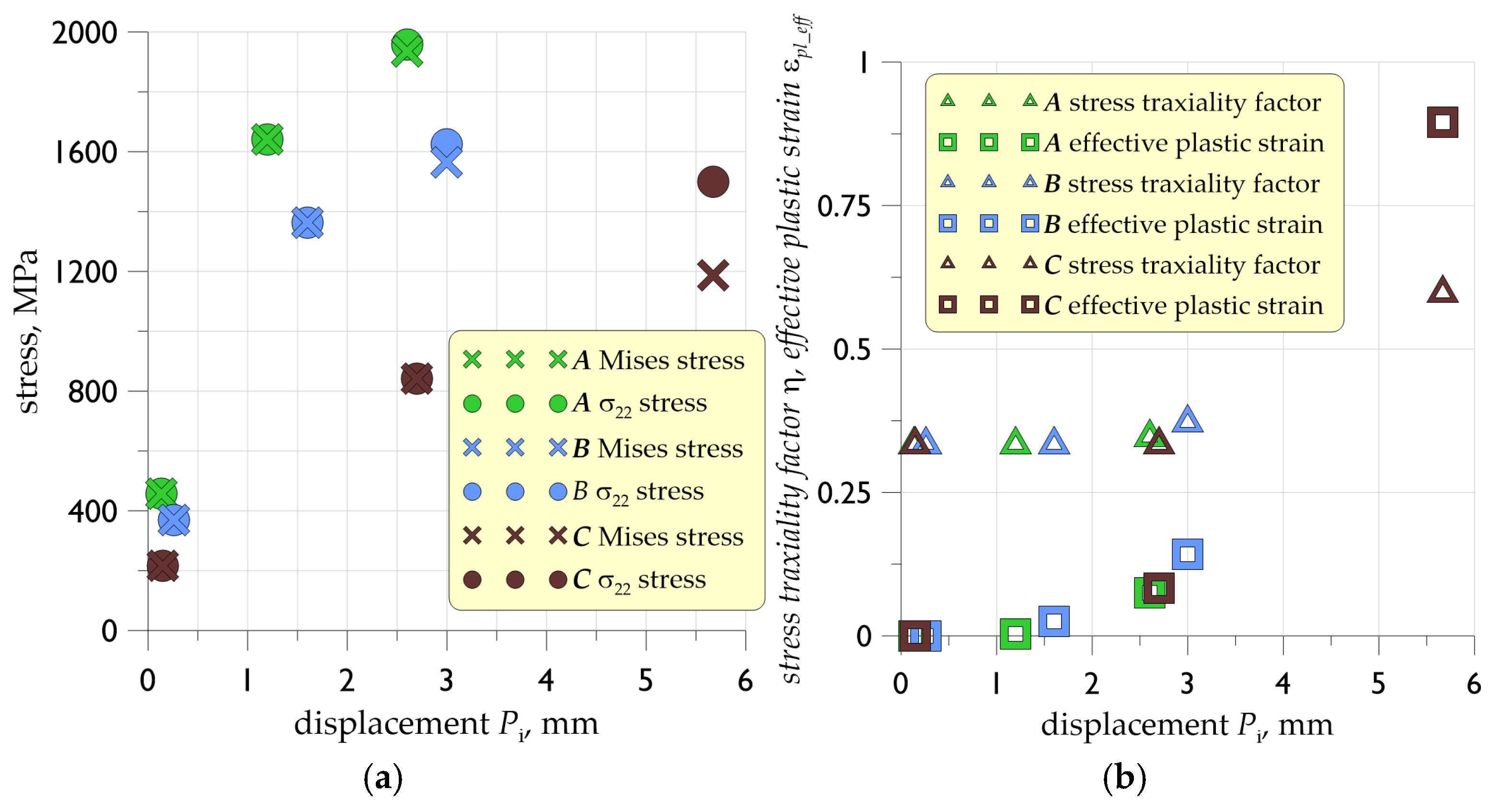 Three values of displacement applied to the specimen were assumed in the numerical calculation programme for each of the materials analysed: