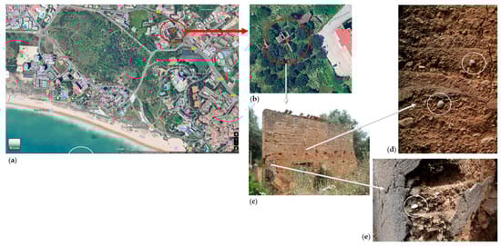 Location and wall with shells in the city of Alvor: (a) location of the wall near the sea; (b) approximate location of the wall; (c–e) shells found on the wall from the construction period.