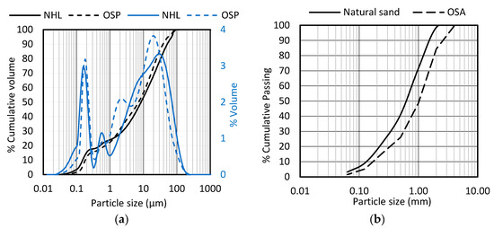 Figure 2a presents the particle size distribution by laser diffraction using the Malvern Mastersizer 2000 system (Mastersizer Software, V5.61) of NHL 3.5 and oyster-shell powder (OSP). Figure 2b corresponds to the particle size distribution of sand and oyster-shell aggregate (OSA) carried out according to EN 1015-1 standard [26].