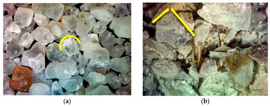 Aggregates particles representation assessed by stereomicroscopy: (a) natural sand, rounded grains (yellow); (b) oyster-shell aggregate, elongated grains (yellow).