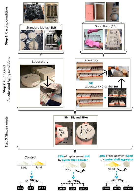 Although previous studies have examined changes in mortar properties using different application conditions and artificial aging [18,20], as well as the influence of alternative preparation methods in mortars with fibers [22], research focusing on the use of these variables for oyster-shell-waste-based mortars is still limited. Therefore, this study addresses that gap by exploring the performance of natural hydraulic lime mortars incorporating oyster shells (as a partial replacement: lime or sand) when used with different types of molds (laboratory vs. solid ceramic brick substrate) and after accelerated aging.