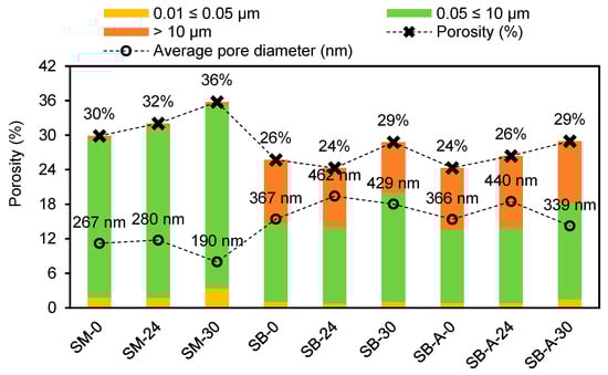 The influence of the substrate on pore structure is also evident. The average pore size seen in Figure 6 of the mortars under SB and SB-A conditions closely matched the average pore size of the brick substrate (≈480 nm) reported from the literature [17,18,20], contributing to the lower total pore volume measured in these samples.