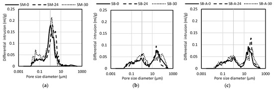 The intrusion porosimetry results revealed that mixes, including control mortar and mortar with 24% OSP, and conditions, applied and detached from the substrate (SB and SB-A) for all mortars, exhibited lower total porosity than those cast in standard molds (SMs), consistent with the findings on open porosity. Furthermore, the porosities measured by MIP for the mortars applied on the substrate were more similar to those measured with water penetration (Figure 5a) compared to the porosities of the SM for all mortars. The literature reported higher porosity due to the higher pressure used in the test with mercury [53,54], which may have a greater impact on the condition of SM mortars.