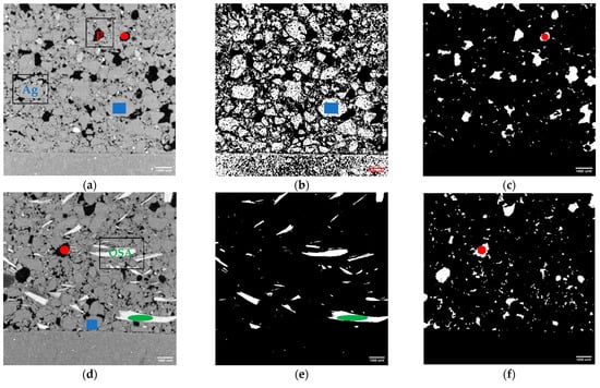 (a,d) full view; (b,c,e,f) filtered view: SB-0: (a) 2D cross-section, (b) aggregates only (blue), and (c) pores only (red); SB-30: (d) 2D cross-section, (e) shells aggregate (green), and (f) pores (red). All figures are drawn to the same scale.