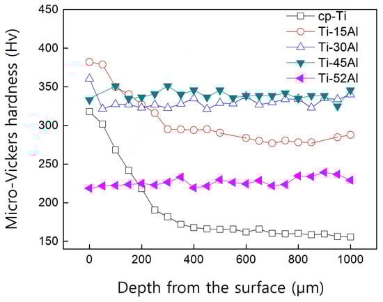 Figure 4 presents the micro-Vickers hardness profiles obtained from the surface to the interior. Open symbols indicate samples exhibiting an alpha-case layer, while closed symbols correspond to alloys in which no distinct reaction zone was detected. The alpha-case thickness was defined as the depth where the hardness returned to the matrix level. For cp-Ti, the alpha-case reached approximately 350 μm, whereas it decreased sharply with increasing aluminum content and became negligible above 30 at% Al. Each hardness value represents the average of three measurements taken at different locations, and the standard deviations were smaller than the symbol size; therefore, error bars are not shown in the figure.